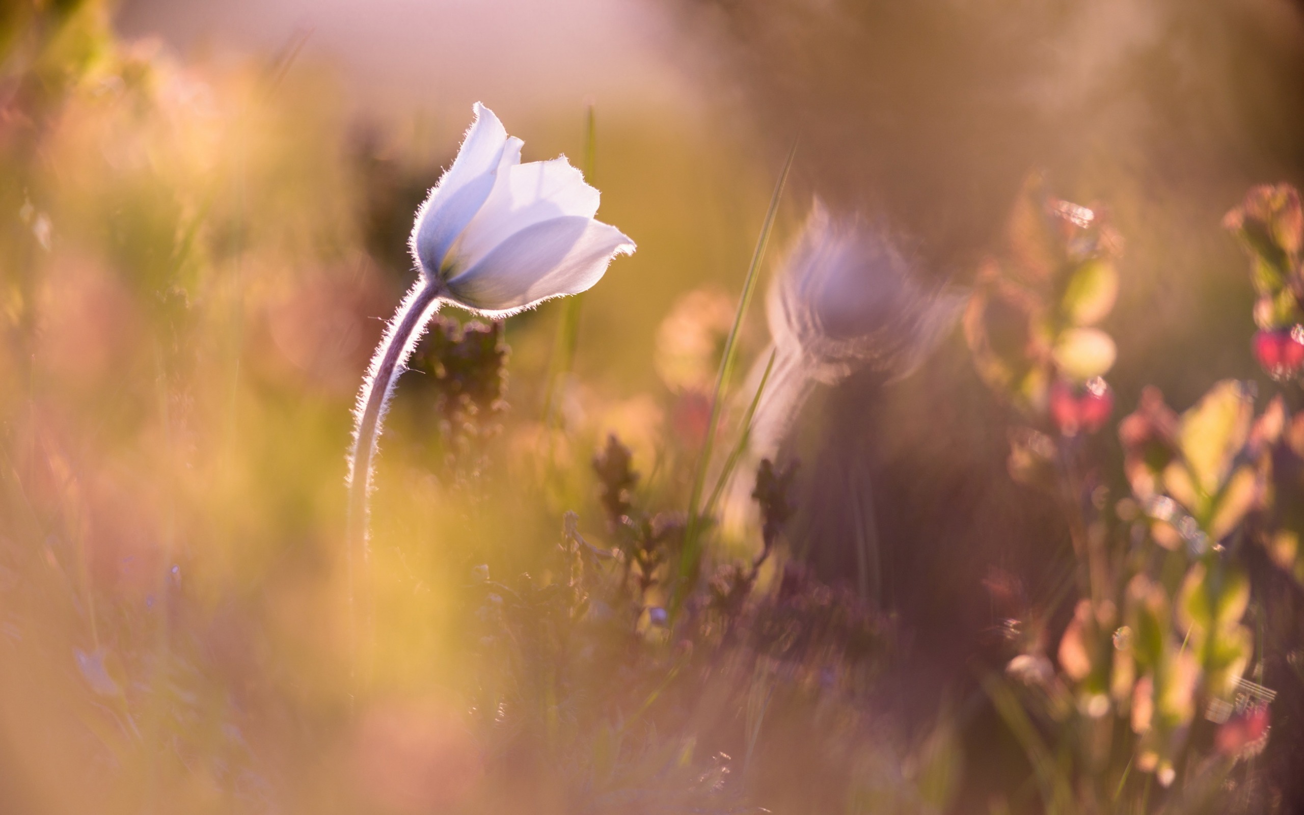 Description: A white flower is in the middle of a field of flowers and grass with a blurry background of grass and flowers.