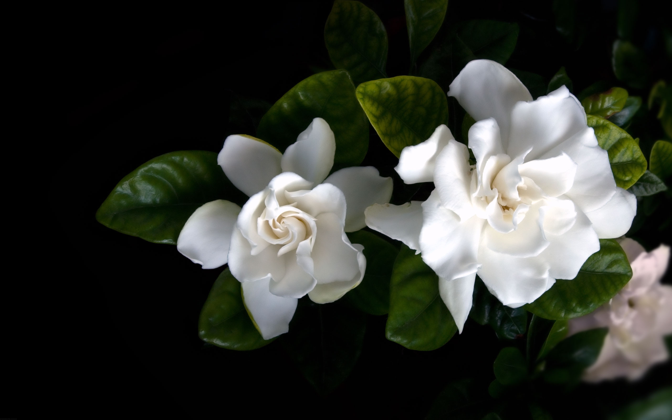 Description: A close up of a white flower with green leaves on a black background with a black background behind it.