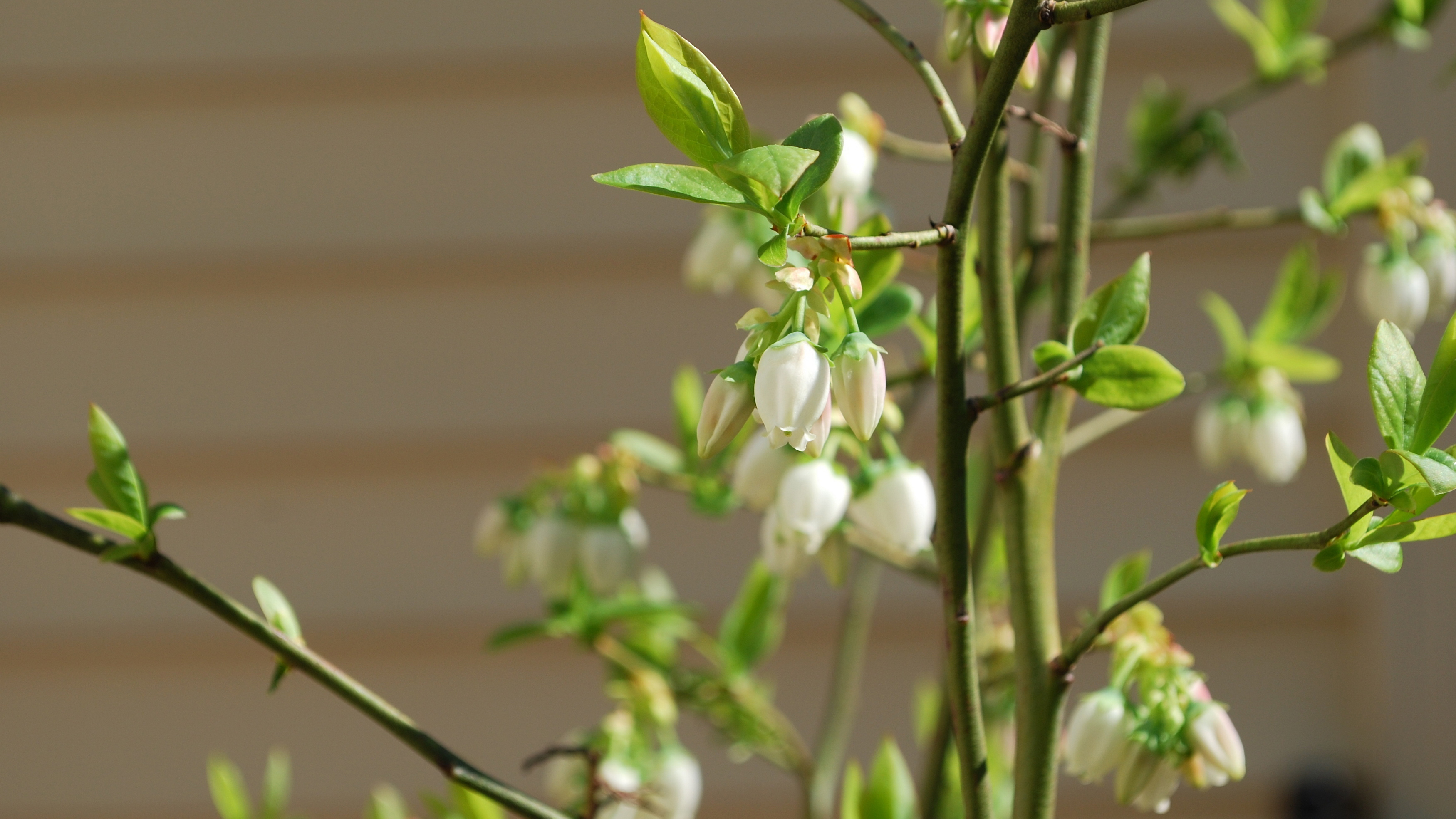Description: A close up of a plant with white flowers and green leaves on it's stems and a house in the background.