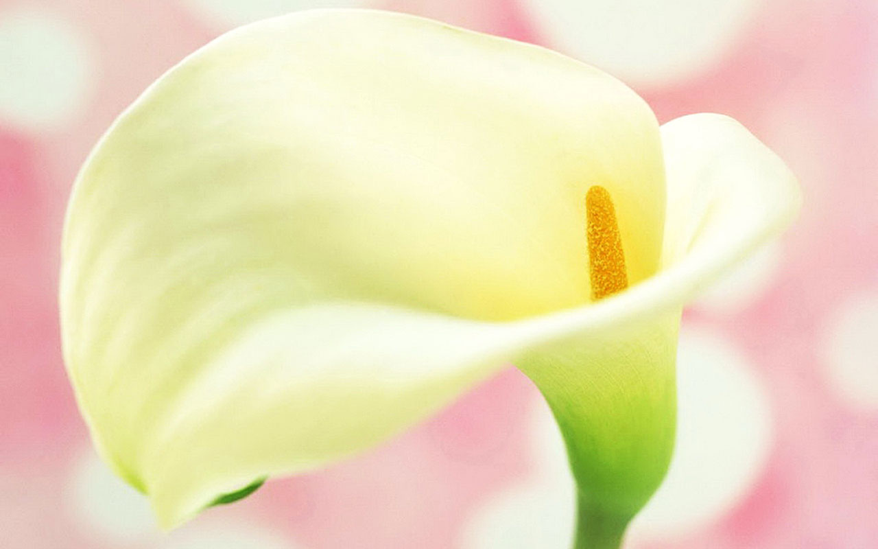 Description: A white flower with a green stem on a pink background with hearts in the background and a pink and white polka dot wall.