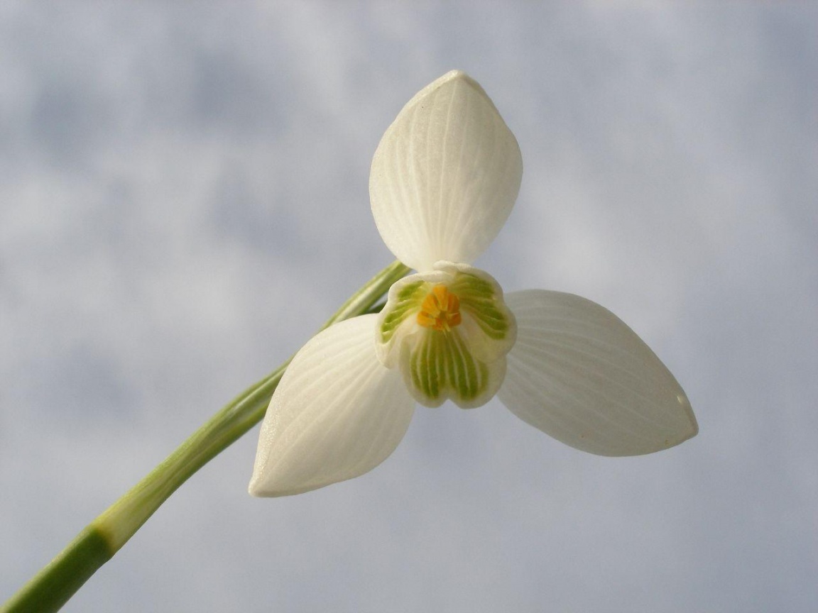 Description: A white flower with a green stem in the sky with clouds in the background and a blue sky with white clouds.