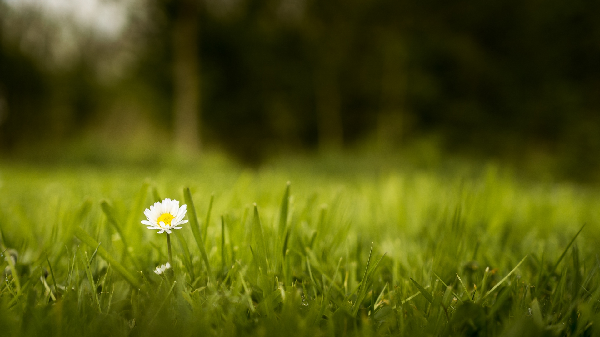 Description: A single white flower sitting in the middle of a field of grass with trees in the background and a blurry background.