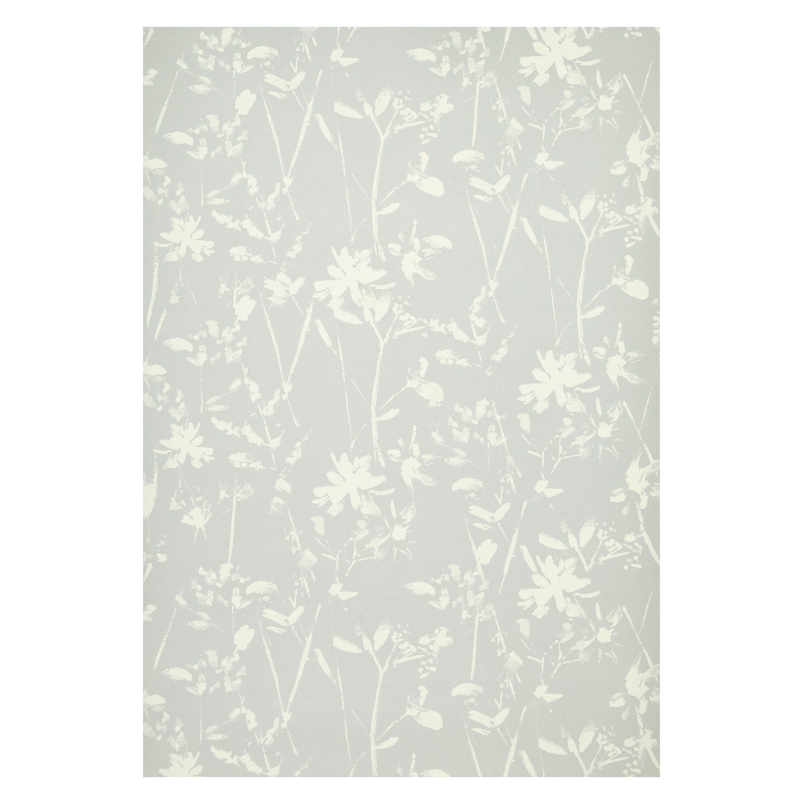 Description: A white flower pattern on a light gray background with white flowers and leaves on the bottom of the pattern.