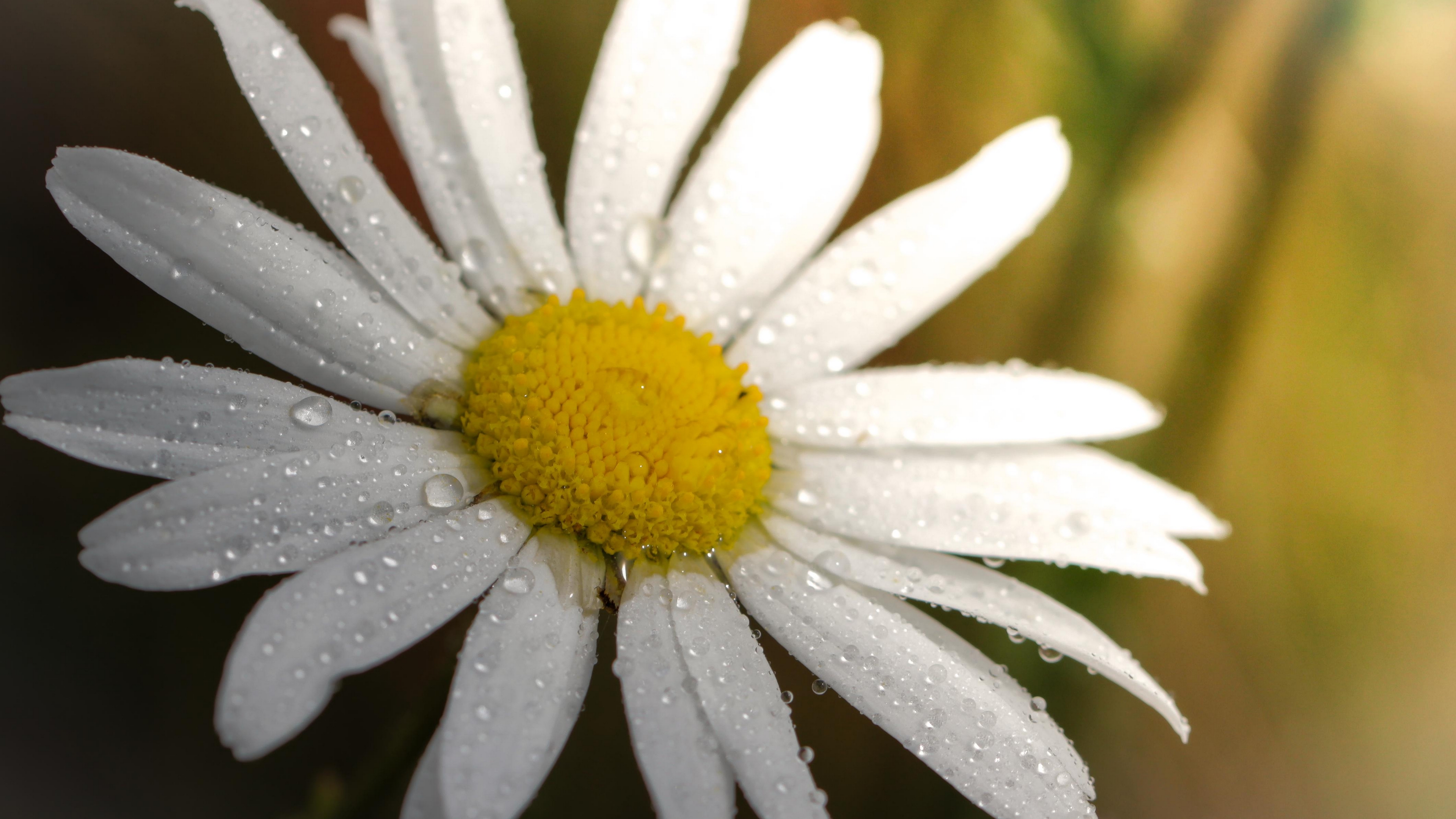 Description: A close up of a white flower with water droplets on it's petals and a green background with a blurry background.