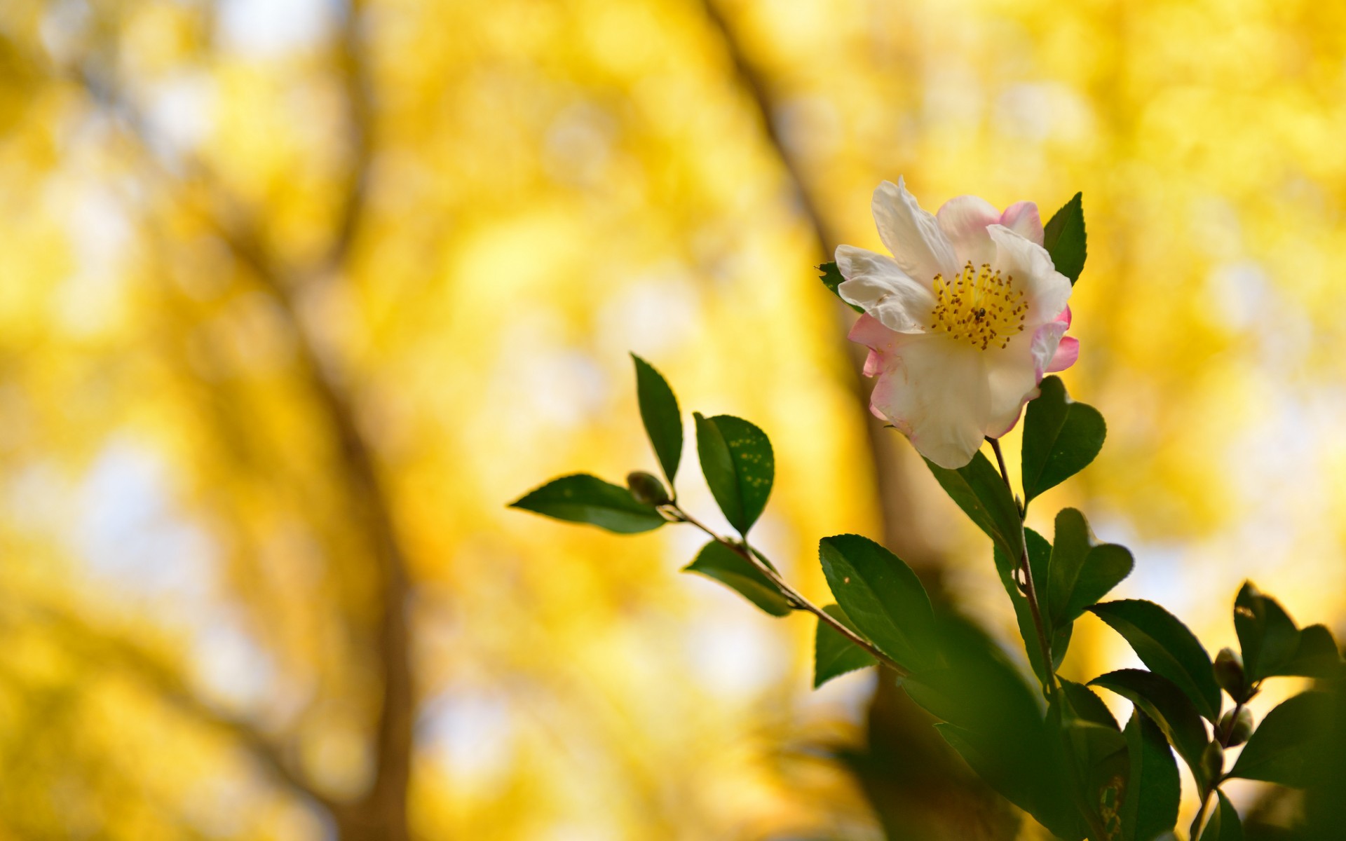 Description: A white flower with a yellow center in front of a tree with yellow leaves and a yellow sky in the background.
