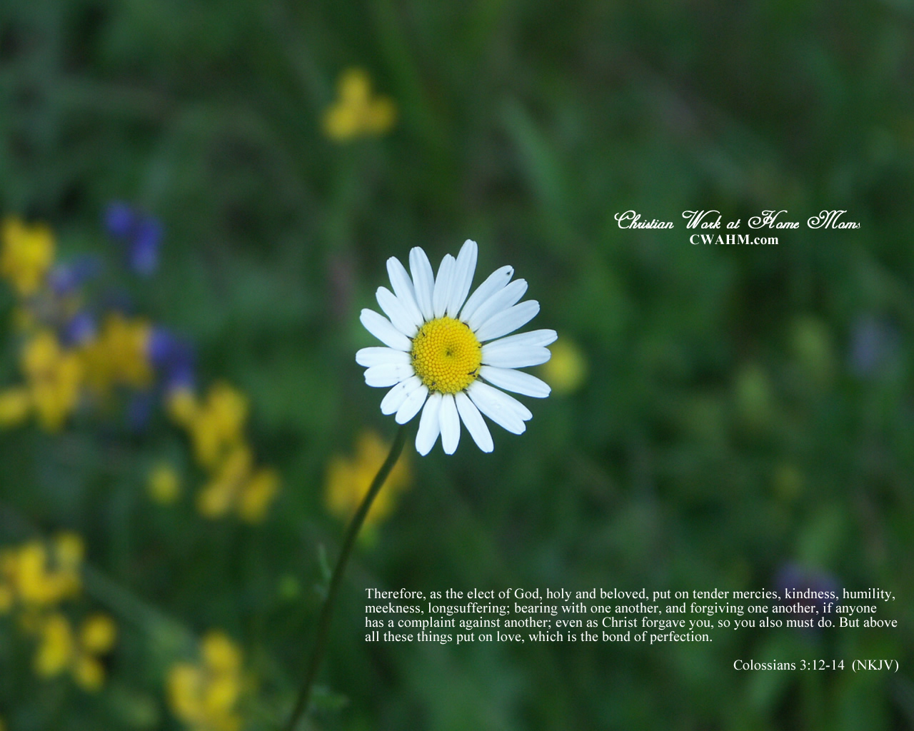 Description: A white flower with a yellow center in a field of flowers with a bible verse written below it on the front.