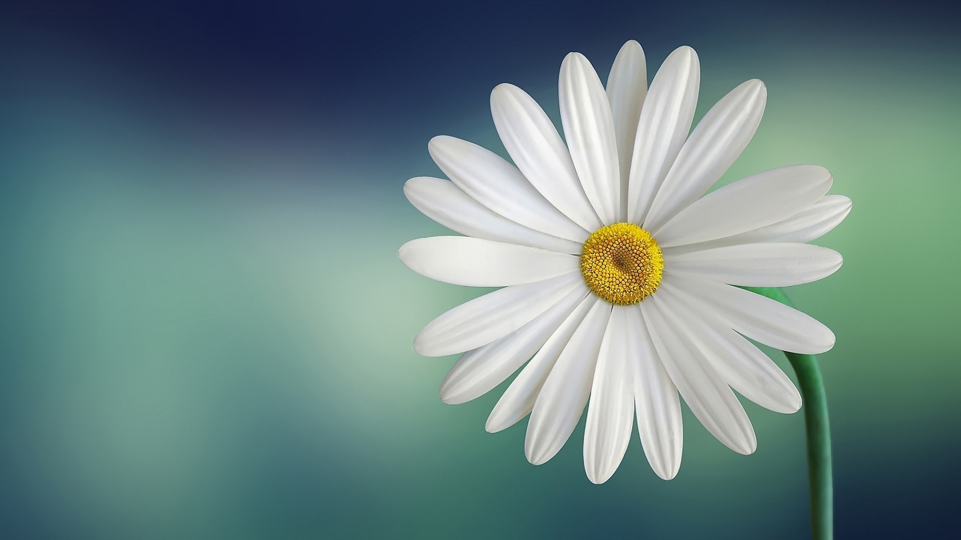 Description: A white flower with a yellow center on a green stem with a blue background with a blurry background.