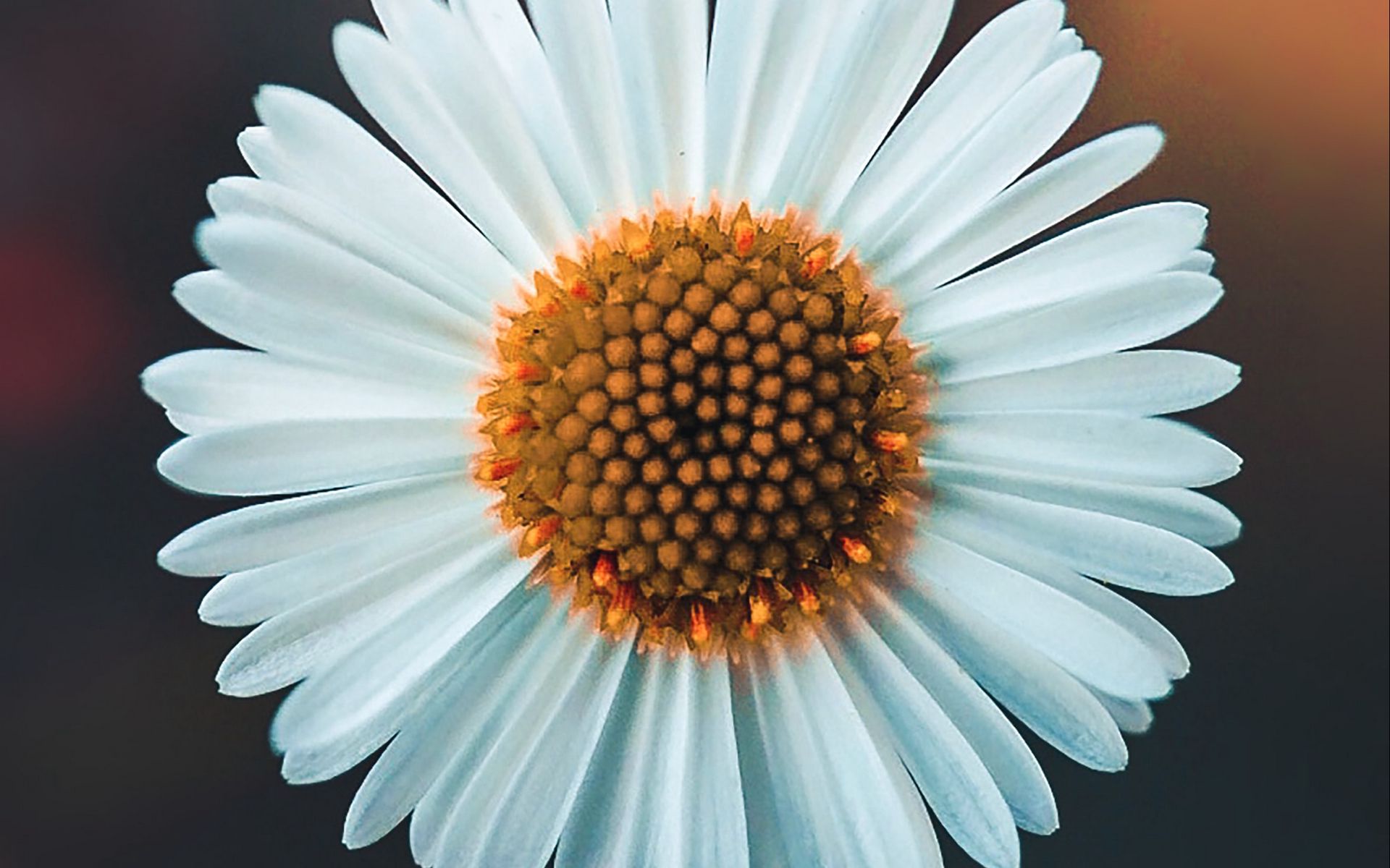 Description: A close up of a white flower with a yellow center and a brown center on the center of the flower.
