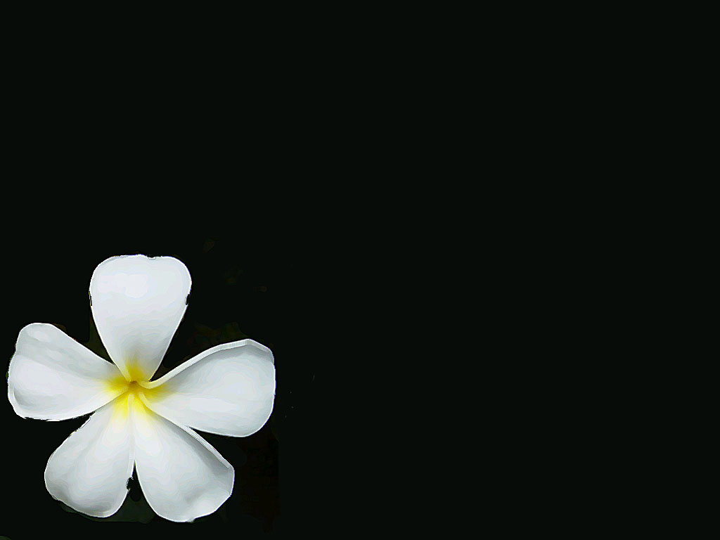 Description: A white flower with a yellow center on a black background with a reflection of the petals on the water.
