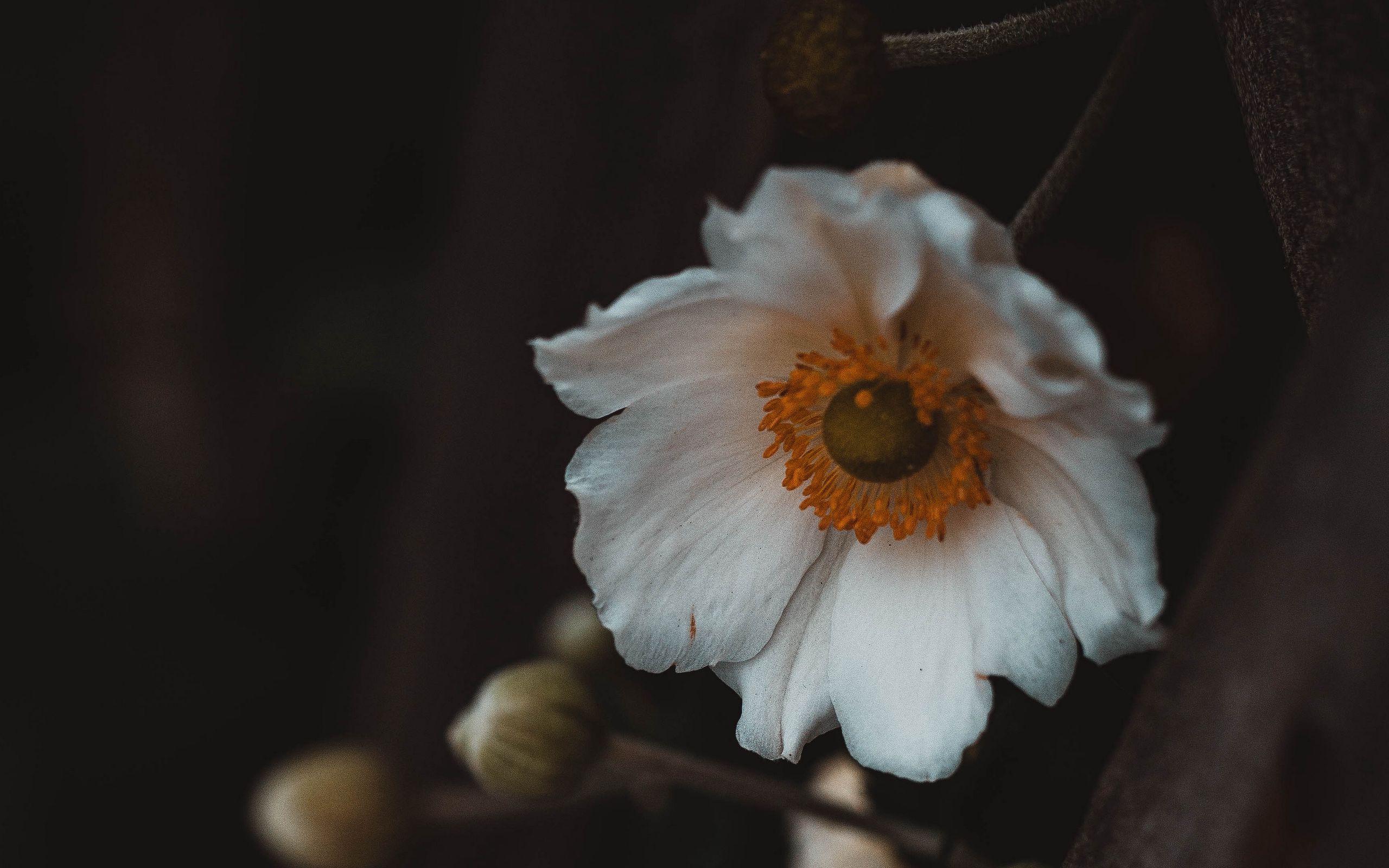 Description: A white flower with a yellow center on a tree branch with other flowers in the background and a dark background.