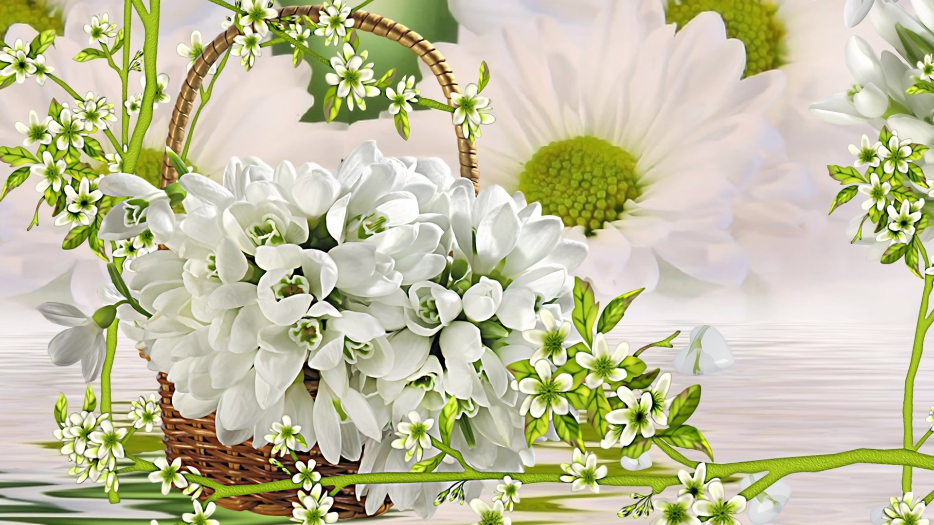 Description: A basket of white flowers sitting on top of a table next to a wallpapered wall with flowers.
