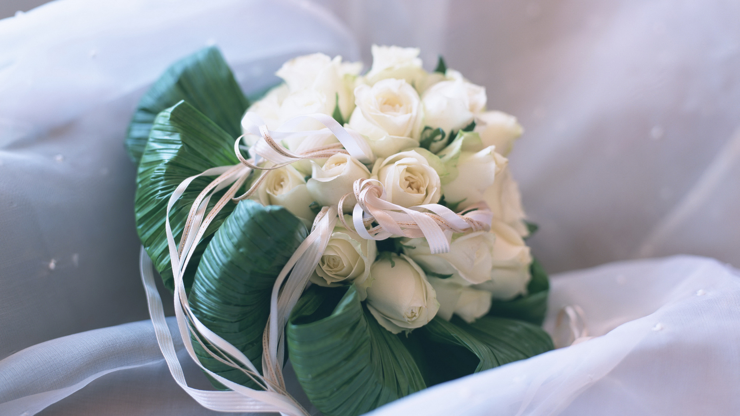 Description: A bouquet of white flowers is wrapped in a white cloth with a ribbon on it and a green leaf.