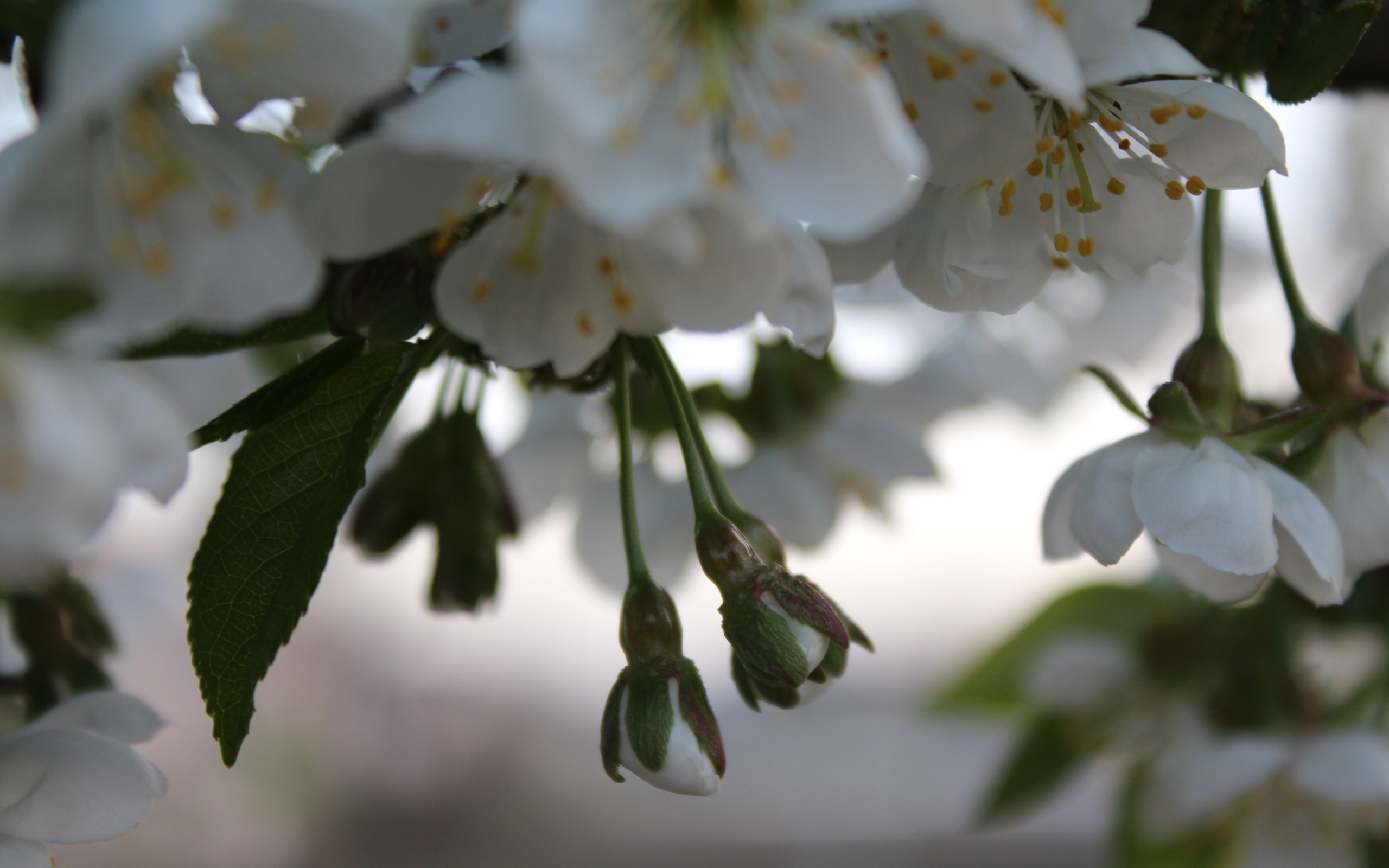 Description: A close up of a bunch of white flowers on a tree branch with leaves and buds on it.