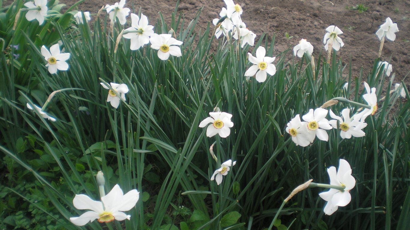 Description: A bunch of white flowers in a field of grass and dirt in the background is a dirt patch and dirt.