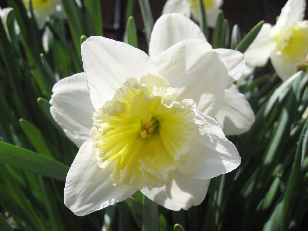 Description: A close up of a bunch of flowers with green stems and white flowers with yellow centers and green leaves.