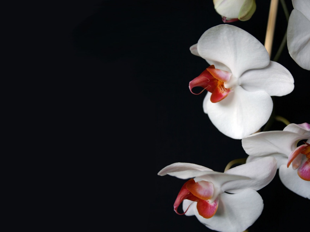 Description: A group of white flowers with red centers on a black background with a black background behind them and a black background with a white flower.