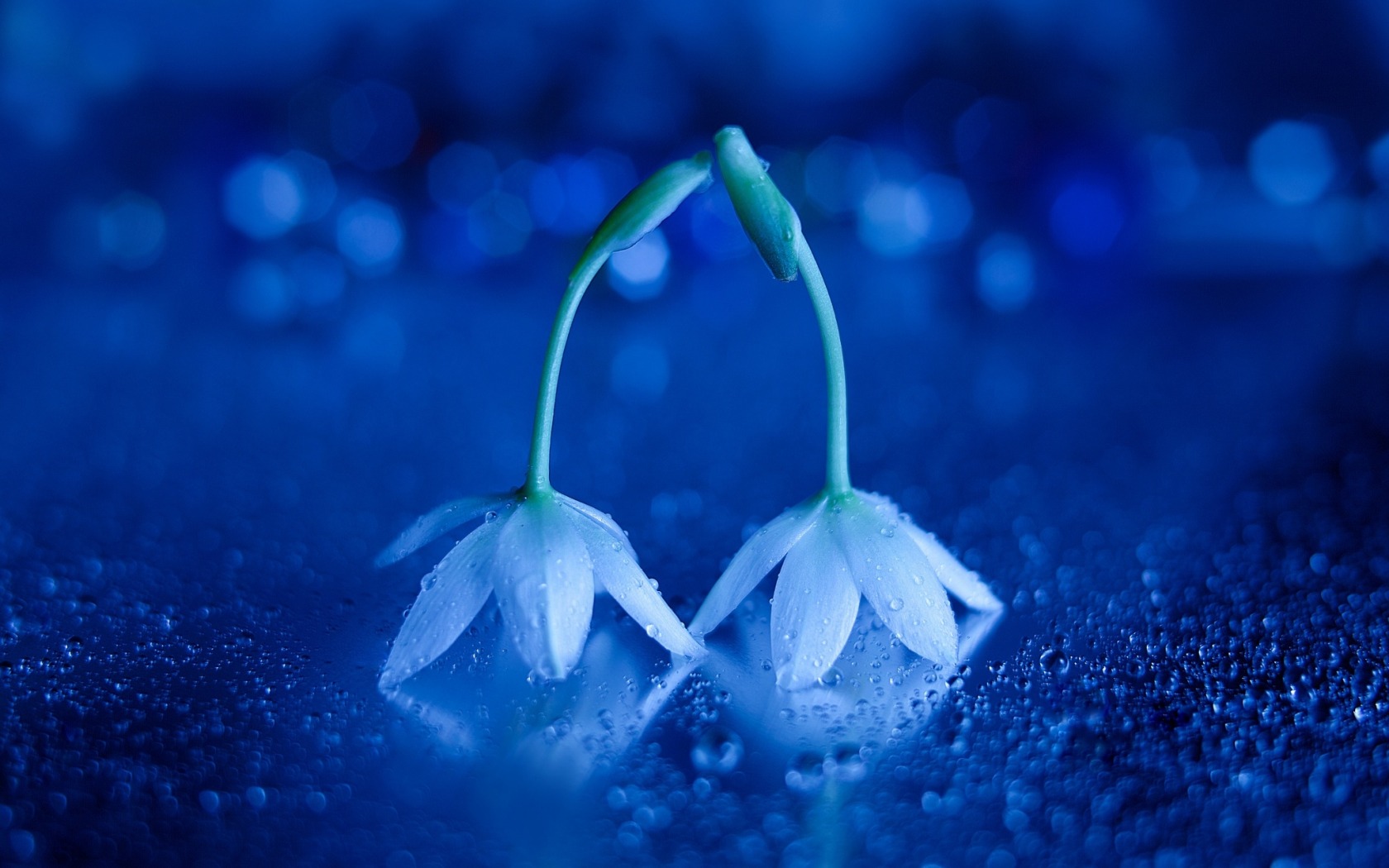 Description: Two white flowers with water droplets on them on a blue background with a blue background and a blue background.
