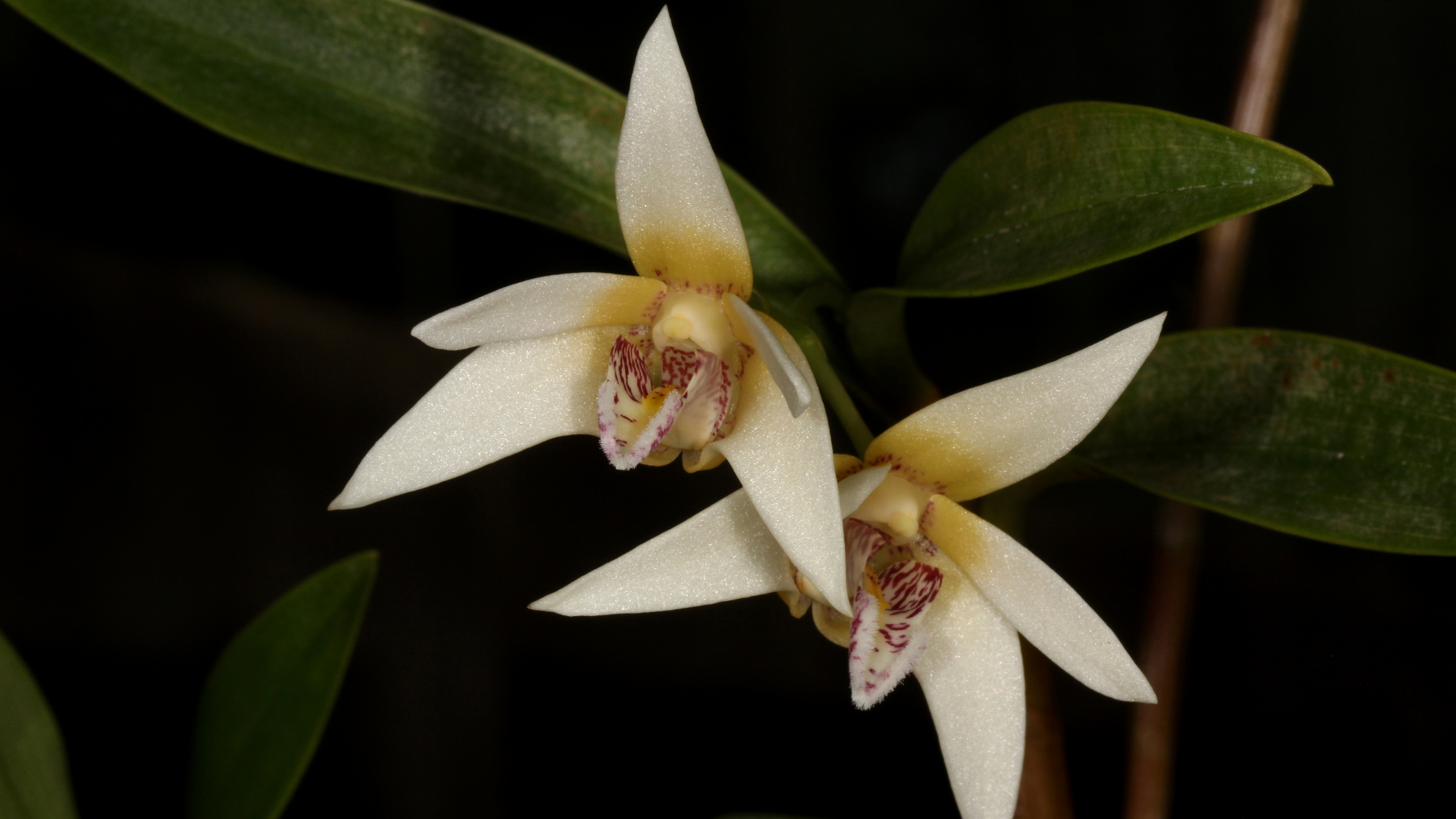 Description: Two white flowers with yellow centers on a green stem with leaves in the background and a dark background behind them.