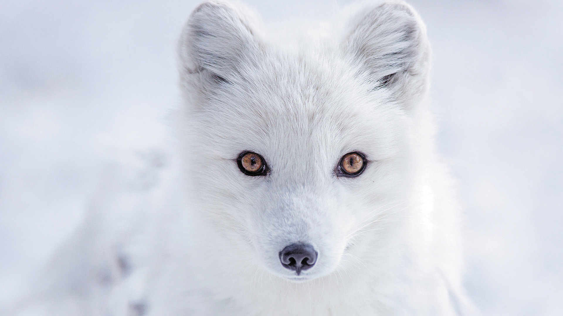 Description: A white fox with brown eyes standing in the snow looking at the camera with a curious look on its face.