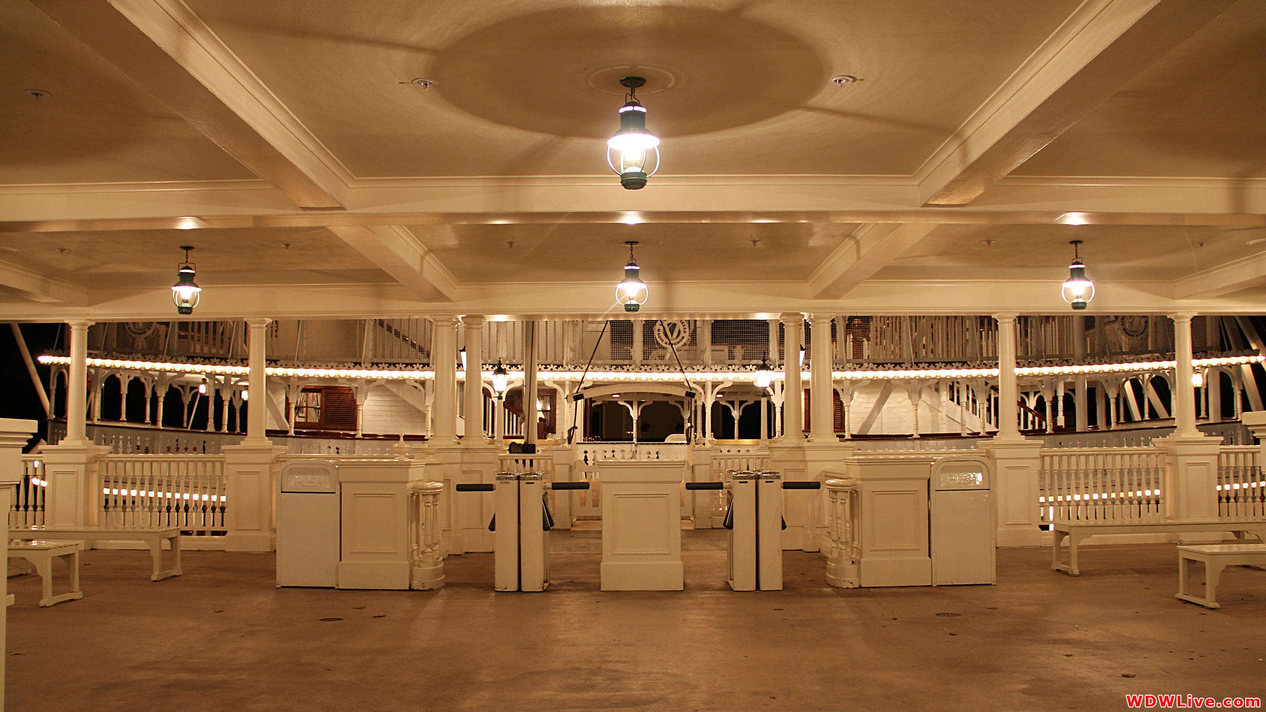 Description: A room with a lot of white furniture and lights on the ceiling and a balcony with a balcony and a balcony.
