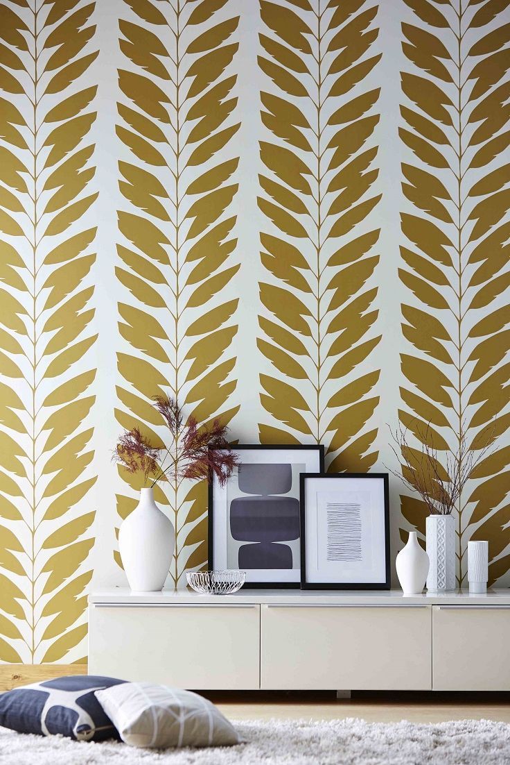 Description: A white and gold wall with a plant and a picture on it and a white rug on the floor.