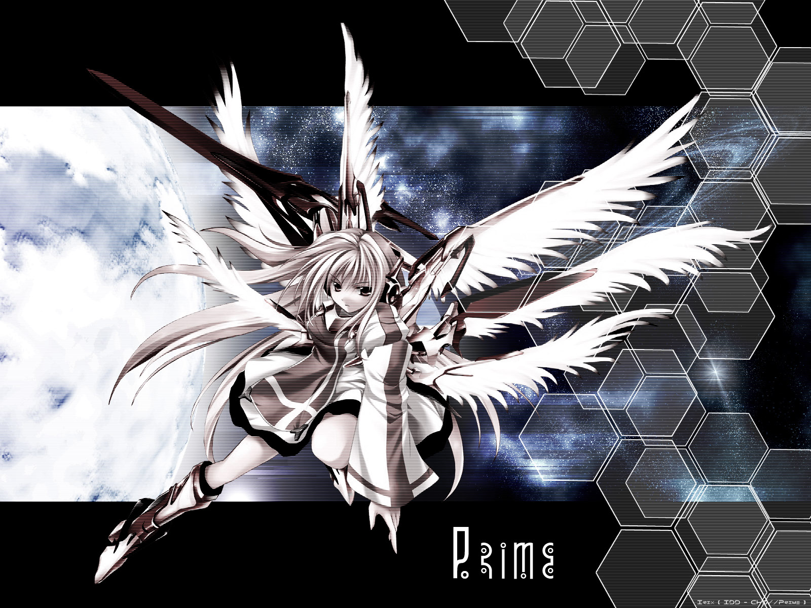 Description: A anime girl with white hair and wings flying in the sky with a background of hexagons.