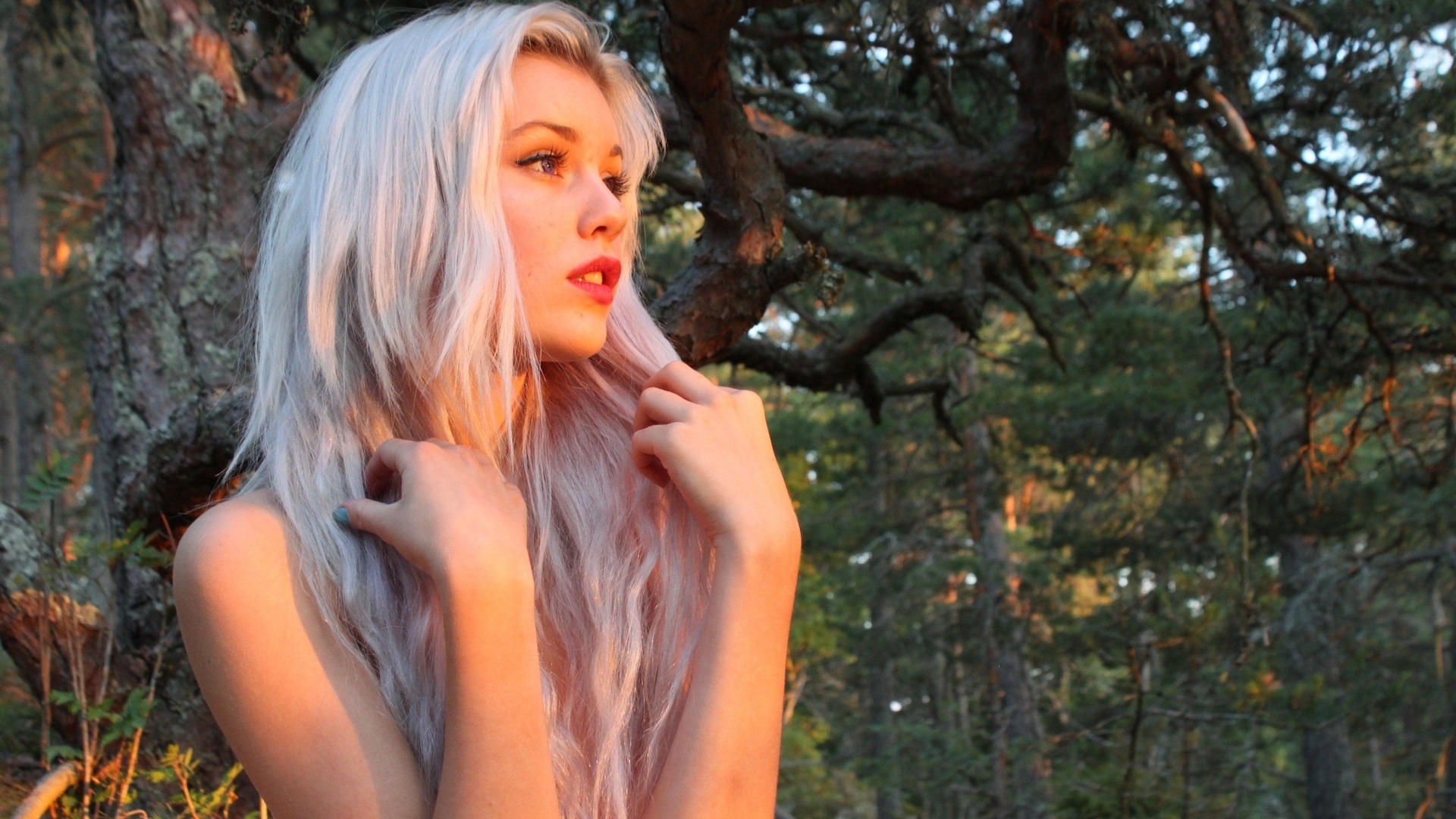 Description: A woman with long white hair standing in a forest with trees in the background and a light colored hair.