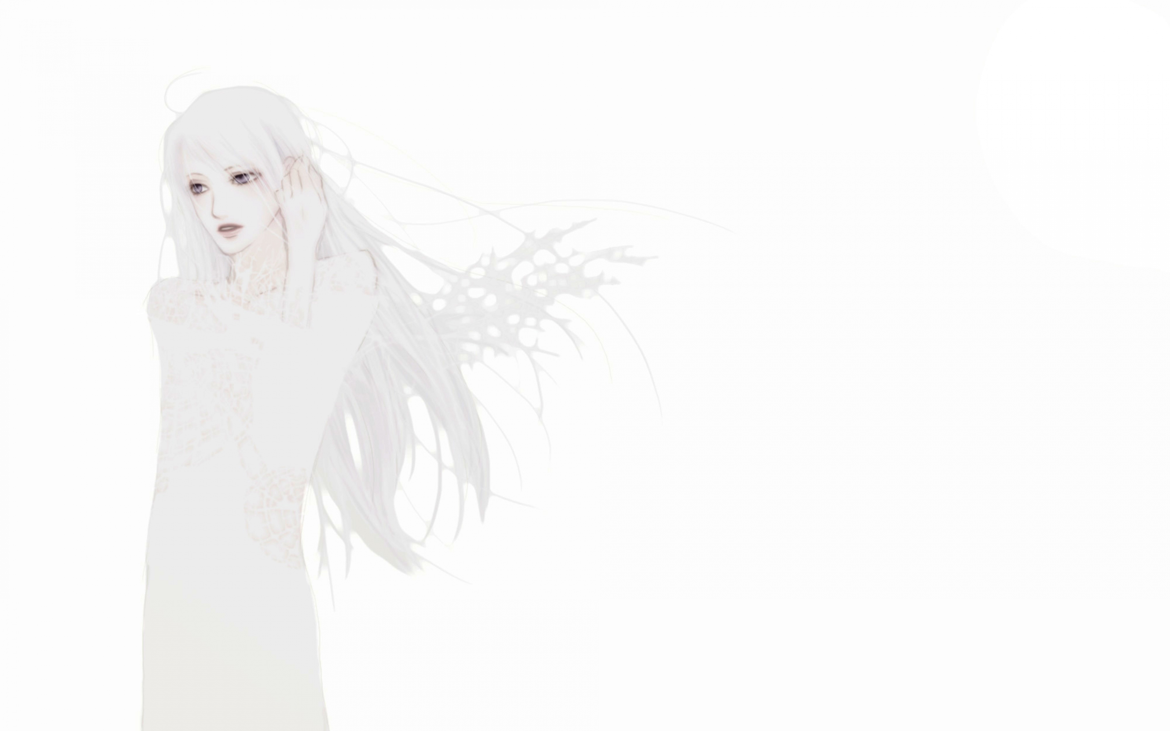 Description: A woman with long white hair and a white dress is standing in the fog with her arms behind her head.