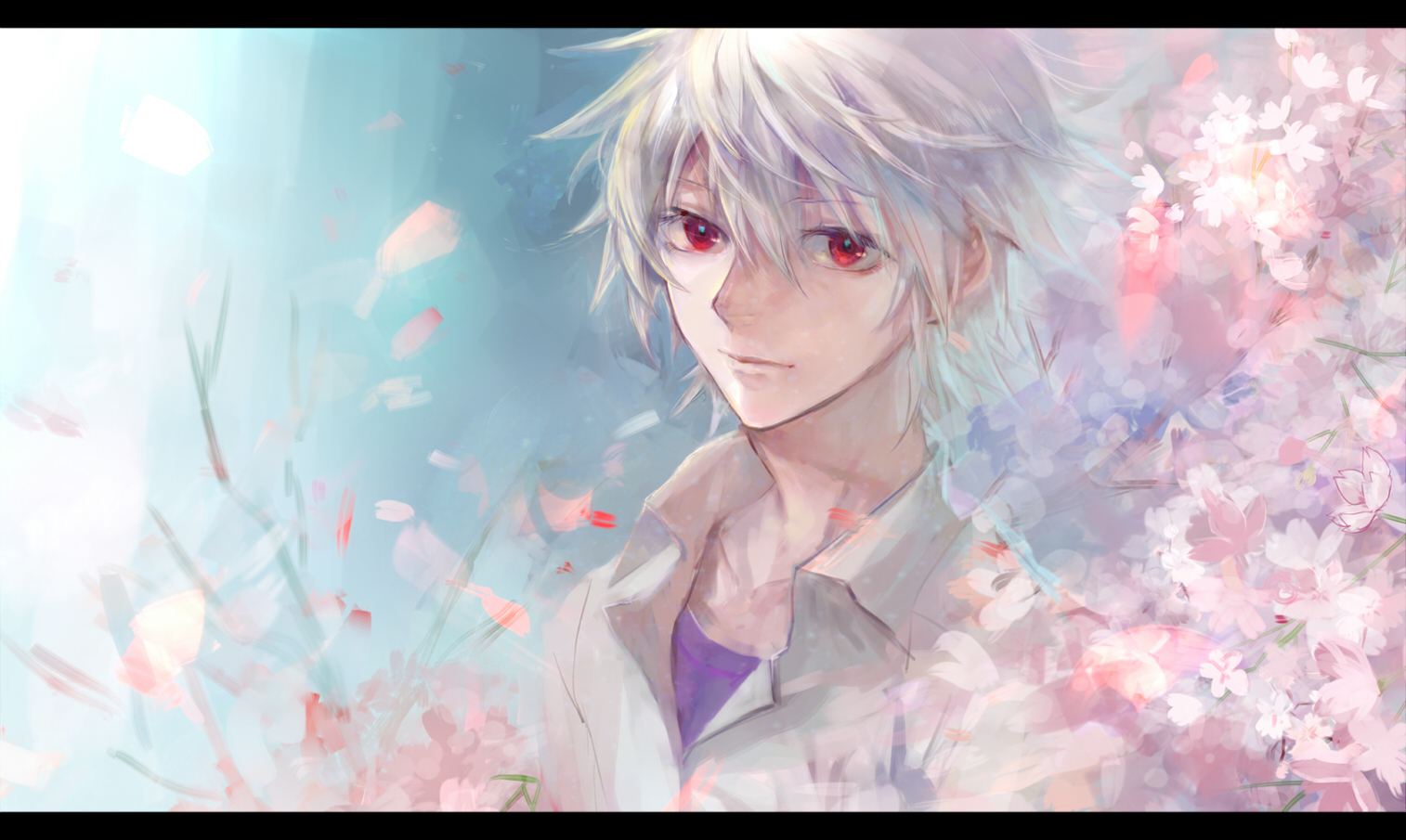Description: A man with white hair and red eyes standing in front of flowers and trees with pink flowers on it.