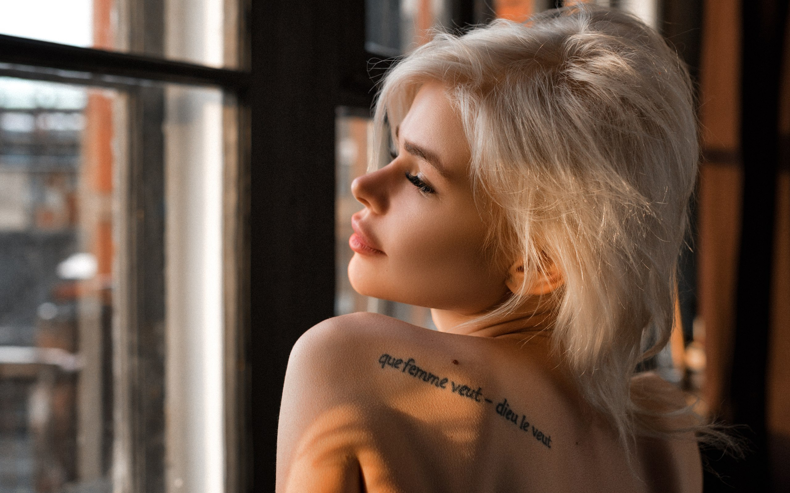 Description: A woman with a tattoo on her back looking out a window at the street outside of a building with a brick wall.