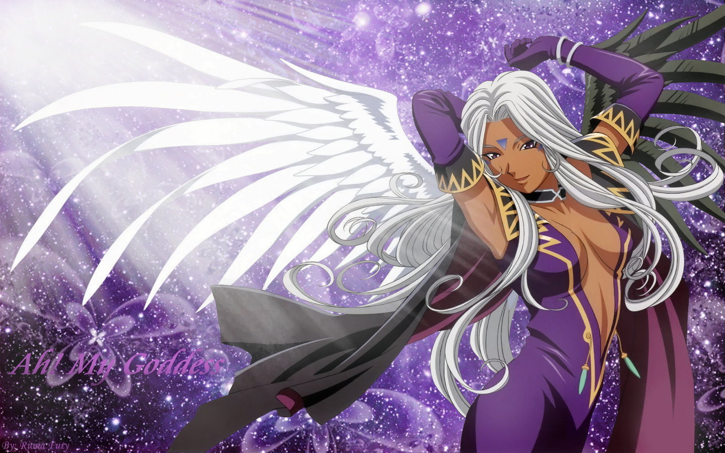 Description: A woman with white hair and wings in a purple dress with stars in the background and a purple sky.