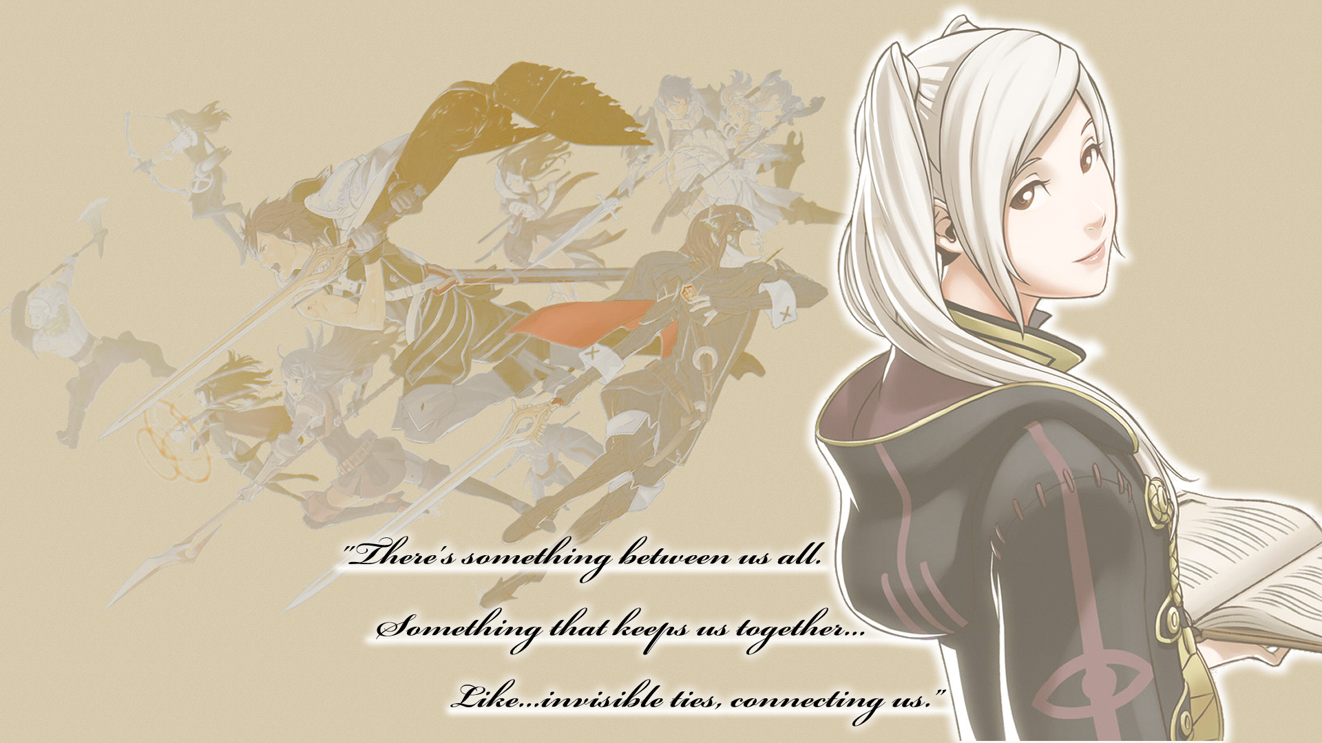 Description: A woman with white hair and a sword in her hand and a quote from the anime series fire emblem.
