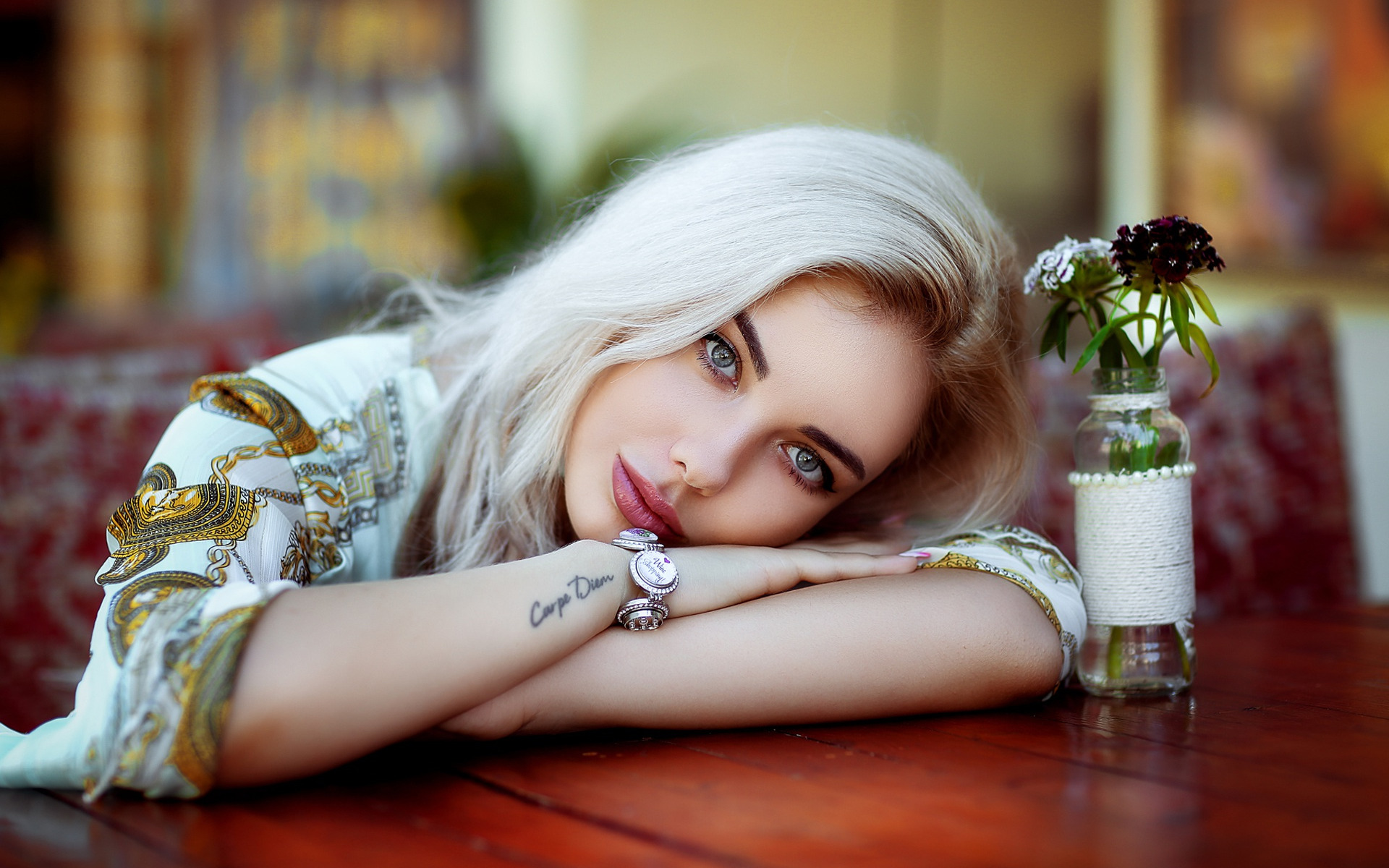 Description: A woman with white hair leaning on a table with a vase of flowers in front of her and a vase of flowers in the background.