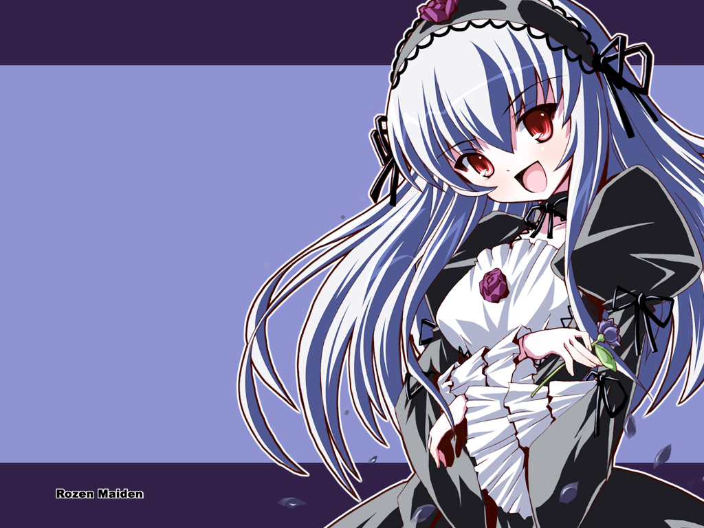 Description: A anime girl with long white hair and a black dress with a flower in her hair and a purple background.