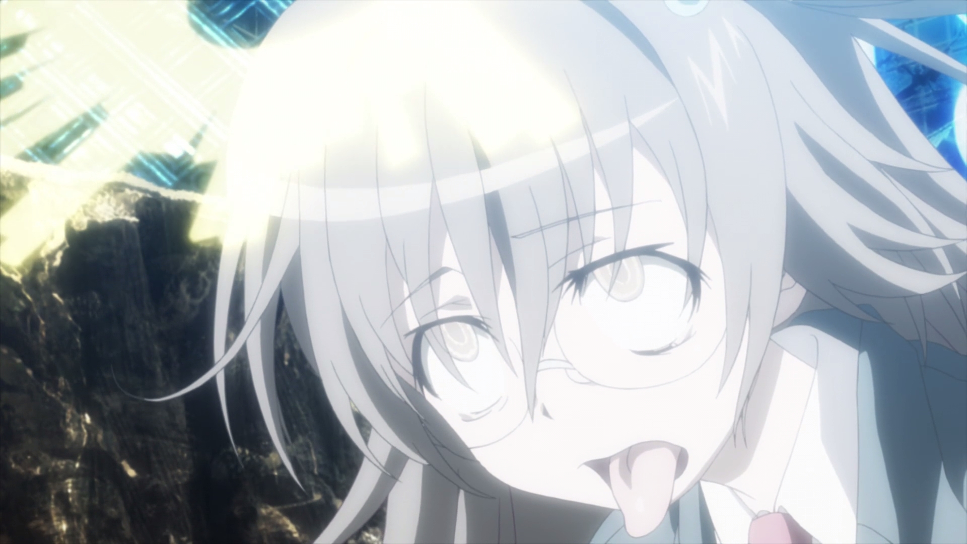 Description: A girl with white hair and a white shirt is looking at something in the distance with her mouth open.