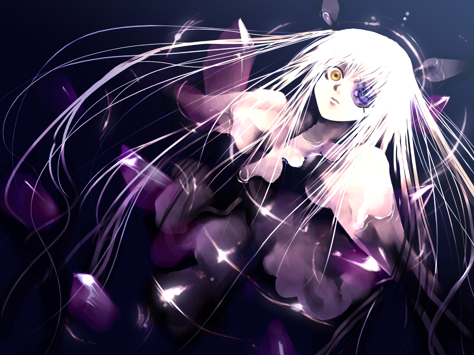 Description: A white haired girl with long hair and a purple background with white flowers and leaves.
