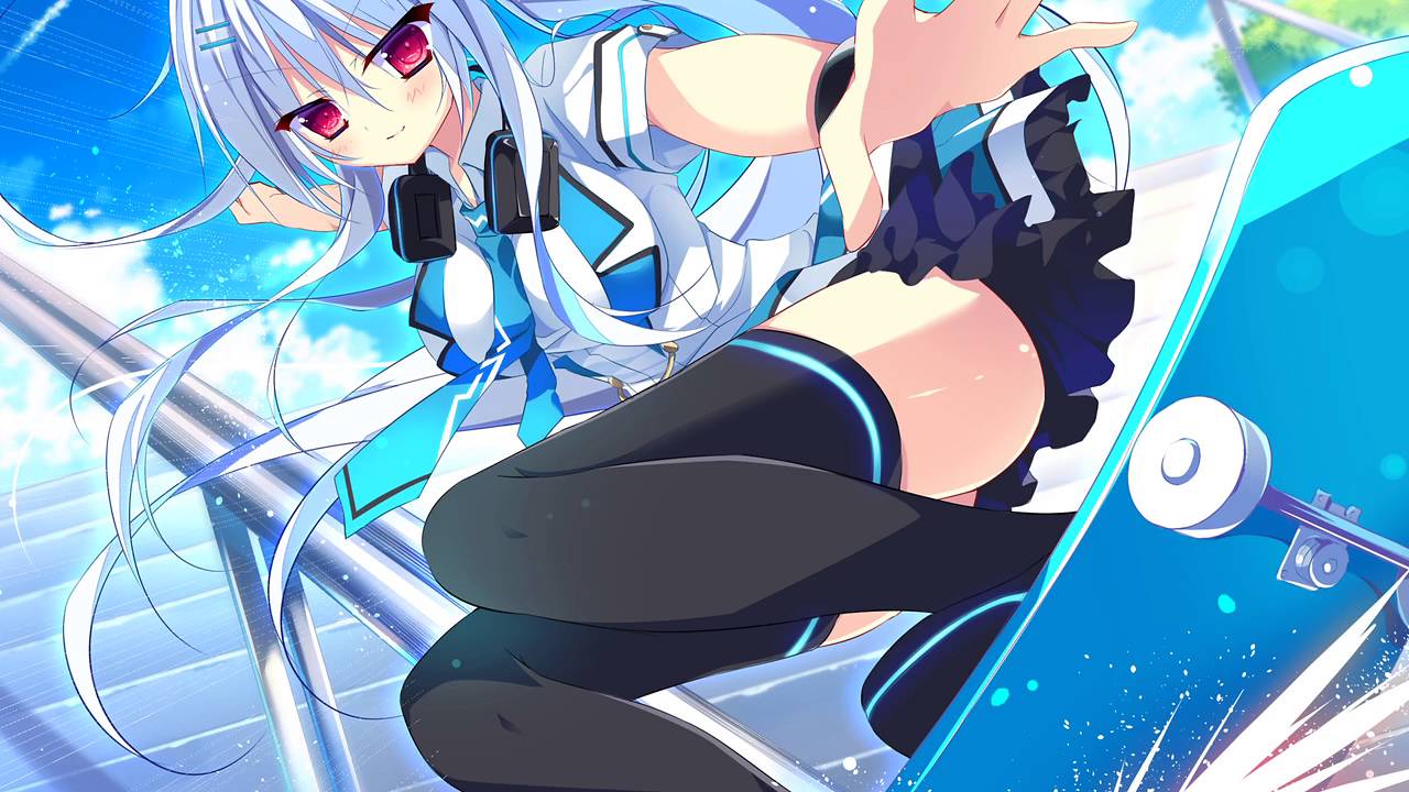 Description: A girl with white hair and glasses holding a skateboard in her hand and wearing black pants and a black top.