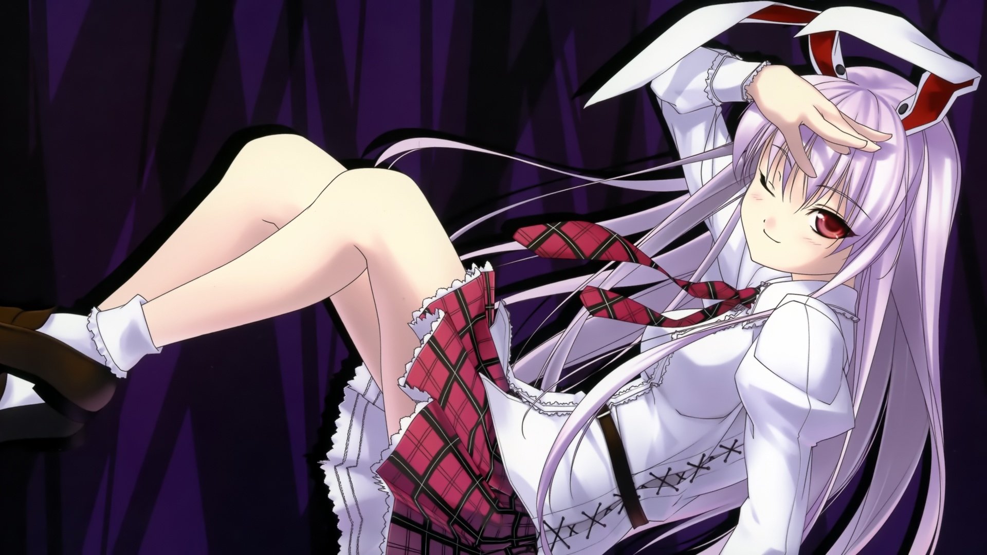 Description: A woman with long white hair and a red and white outfit is sitting on a chair with her legs crossed.