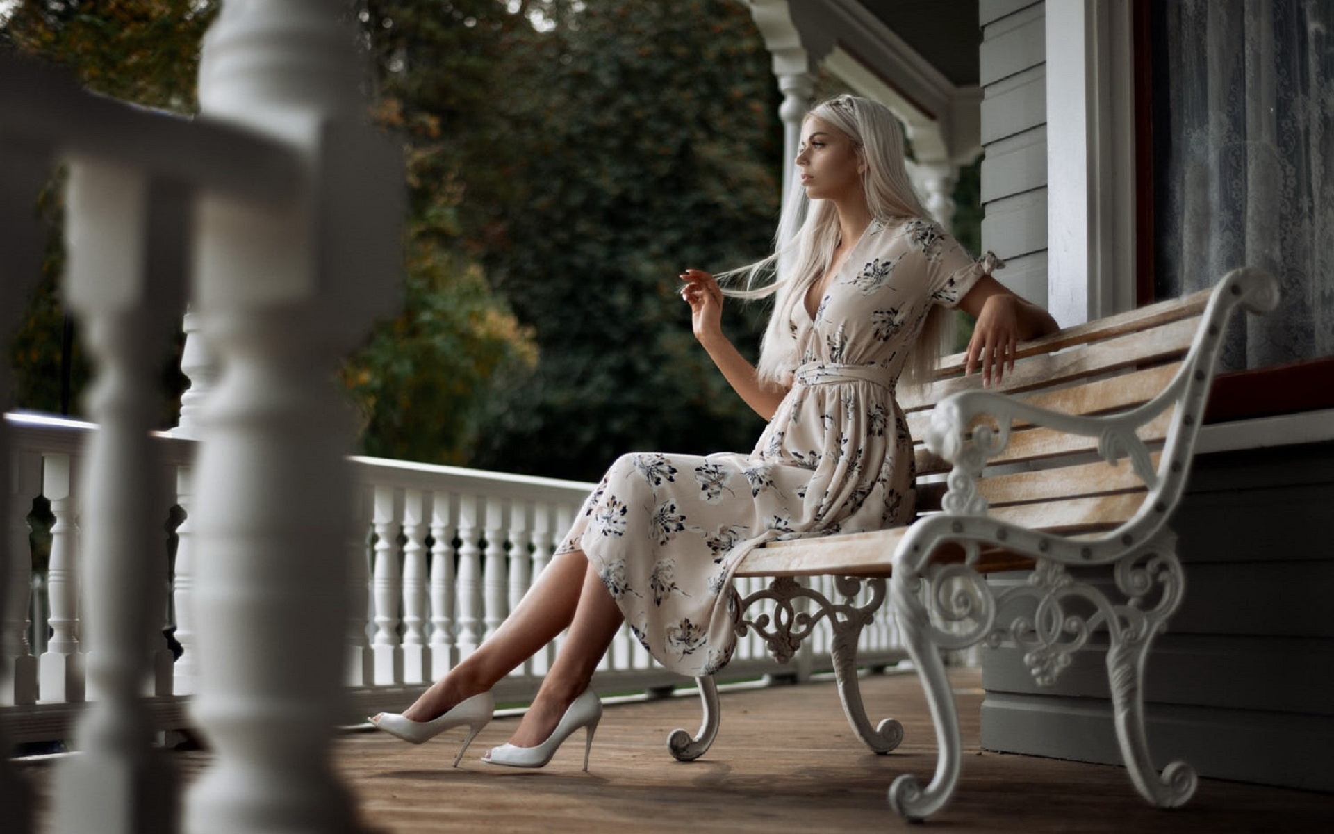 Description: A woman sitting on a bench on a porch with a long white hair blowing in the wind and a white dress.