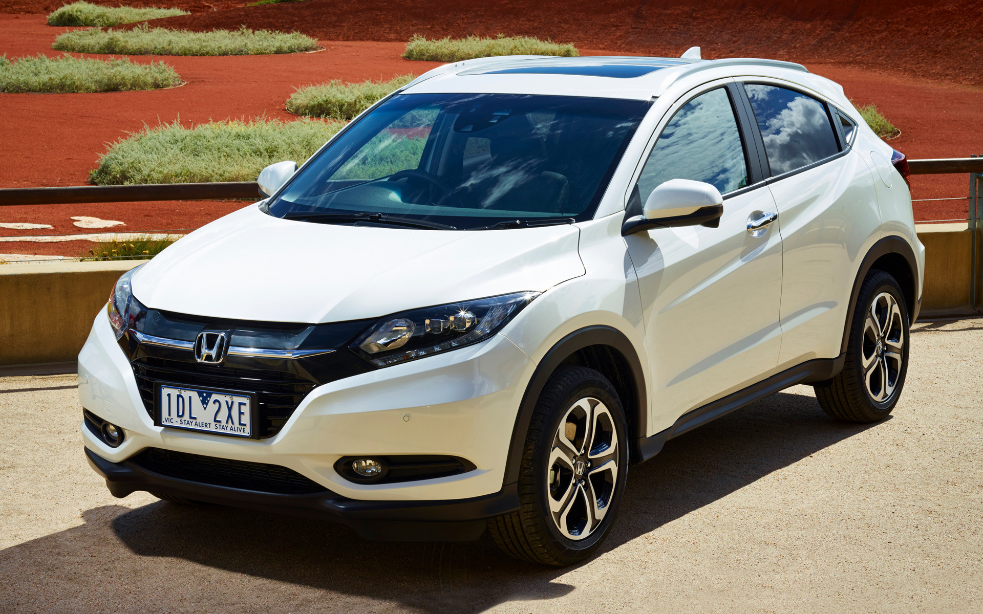 Description: A white honda hr - v parked on a road near a fence and a red dirt area with a green bush.