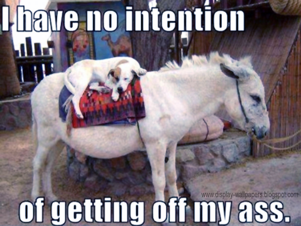 Description: A white horse with a dog on its back and a caption that says.