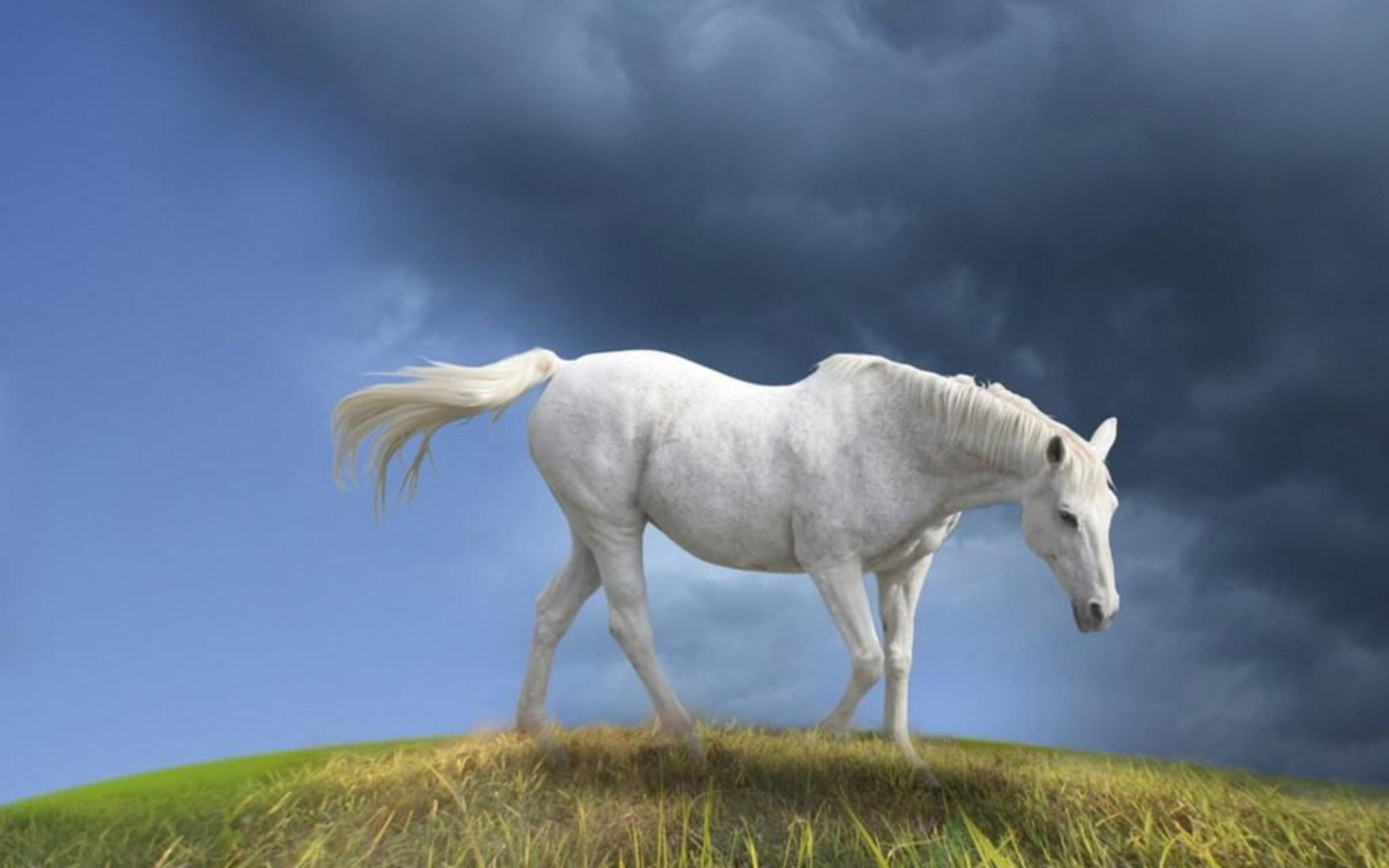 Description: A white horse standing on top of a grass covered hill under a cloudy sky with a white horse standing on top of a green hill.