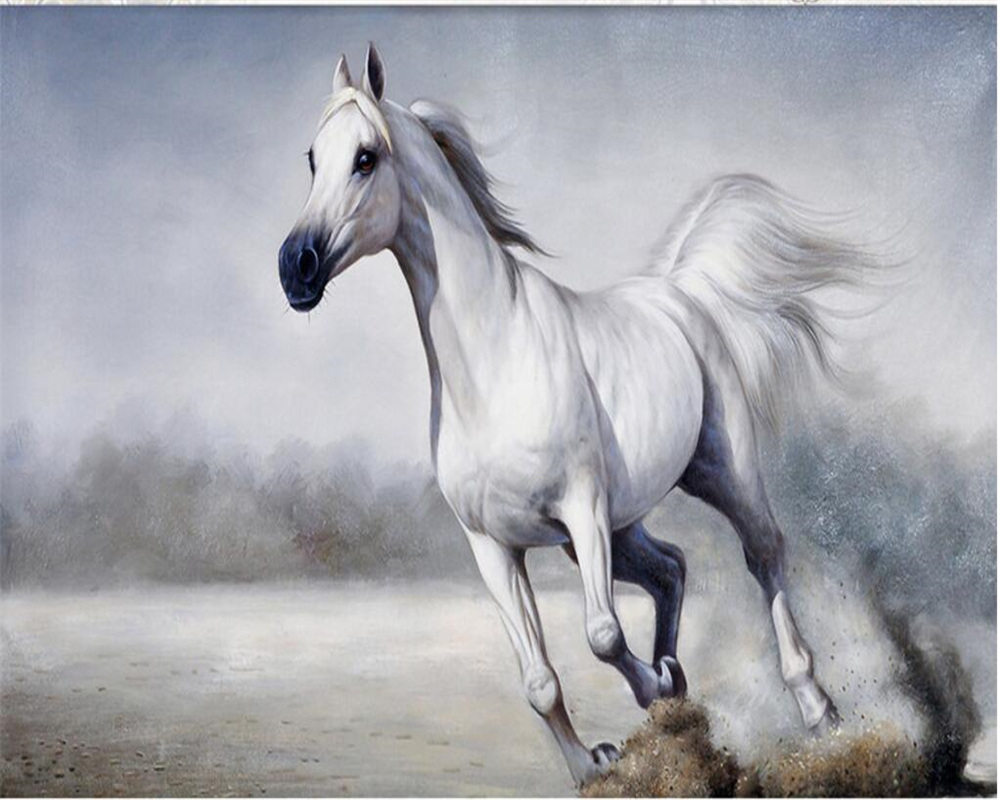 Description: A white horse running in a field with a sky background and a white horse with a blue nose and tail.