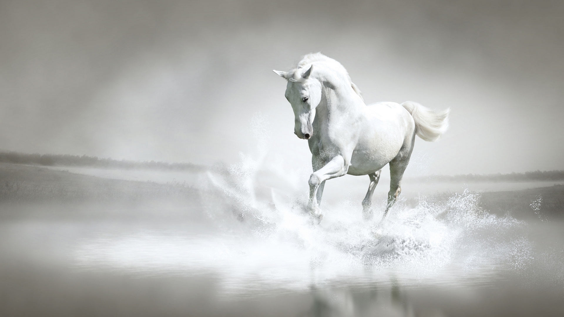 Description: A white horse running through a body of water on a foggy day with a black and white background.