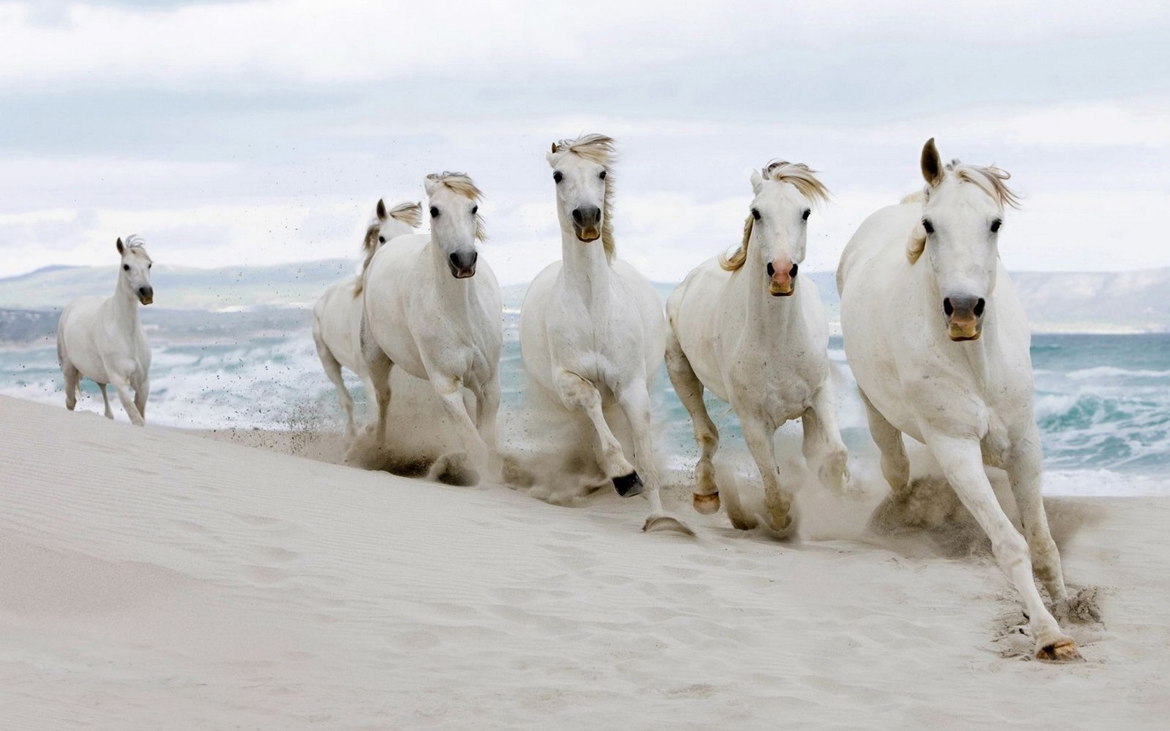 Description: A group of white horses running on a beach near the ocean and water with a sky background and a few clouds.