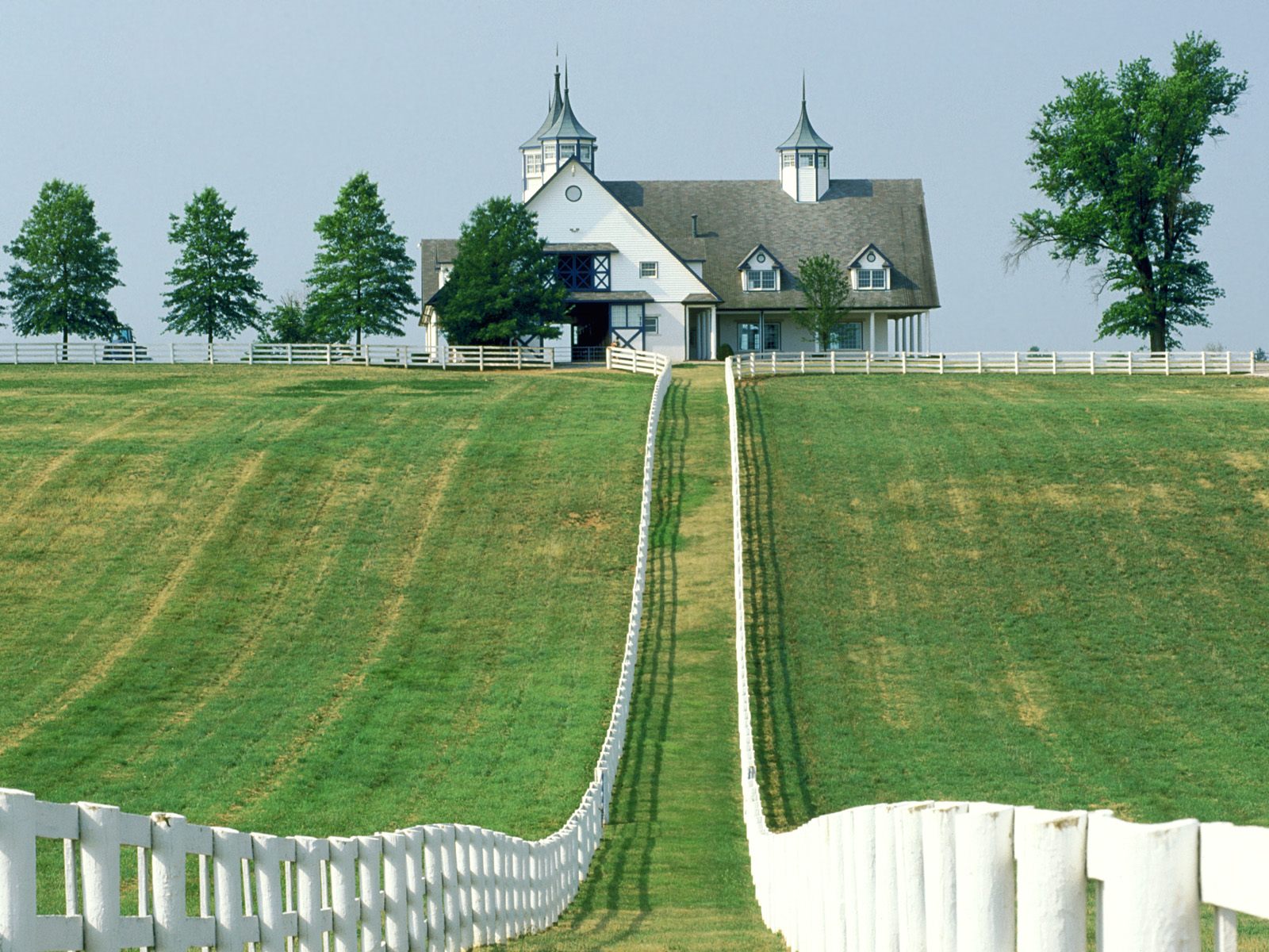 Description: A white house on a hill with a white fence and a white horse grazing in the grass behind it.