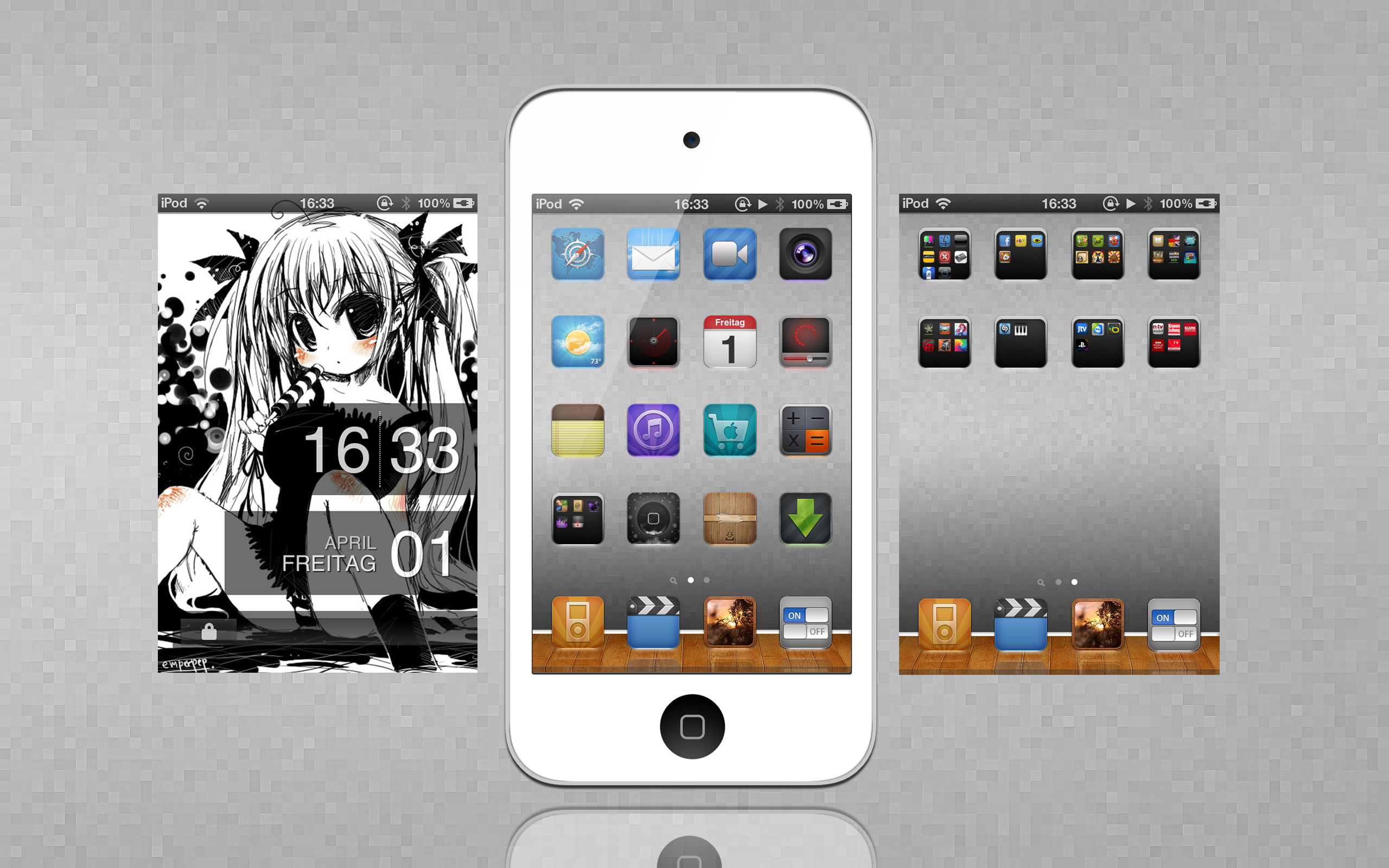 Description: A white iphone with a anime theme on the screen and a clock on the screen and a clock on the wall.
