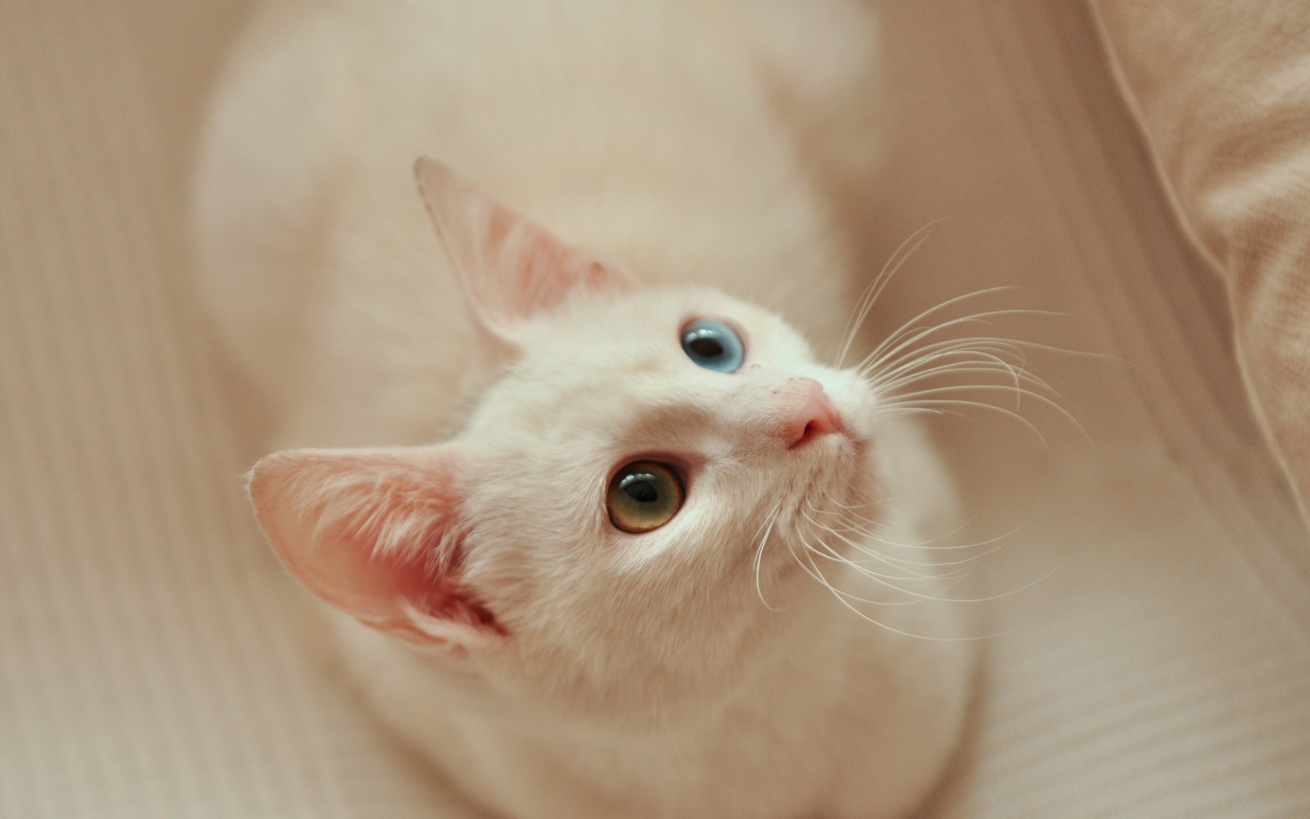 Description: A white kitten with blue eyes laying on a bed looking up at the camera with a curious look on its face.