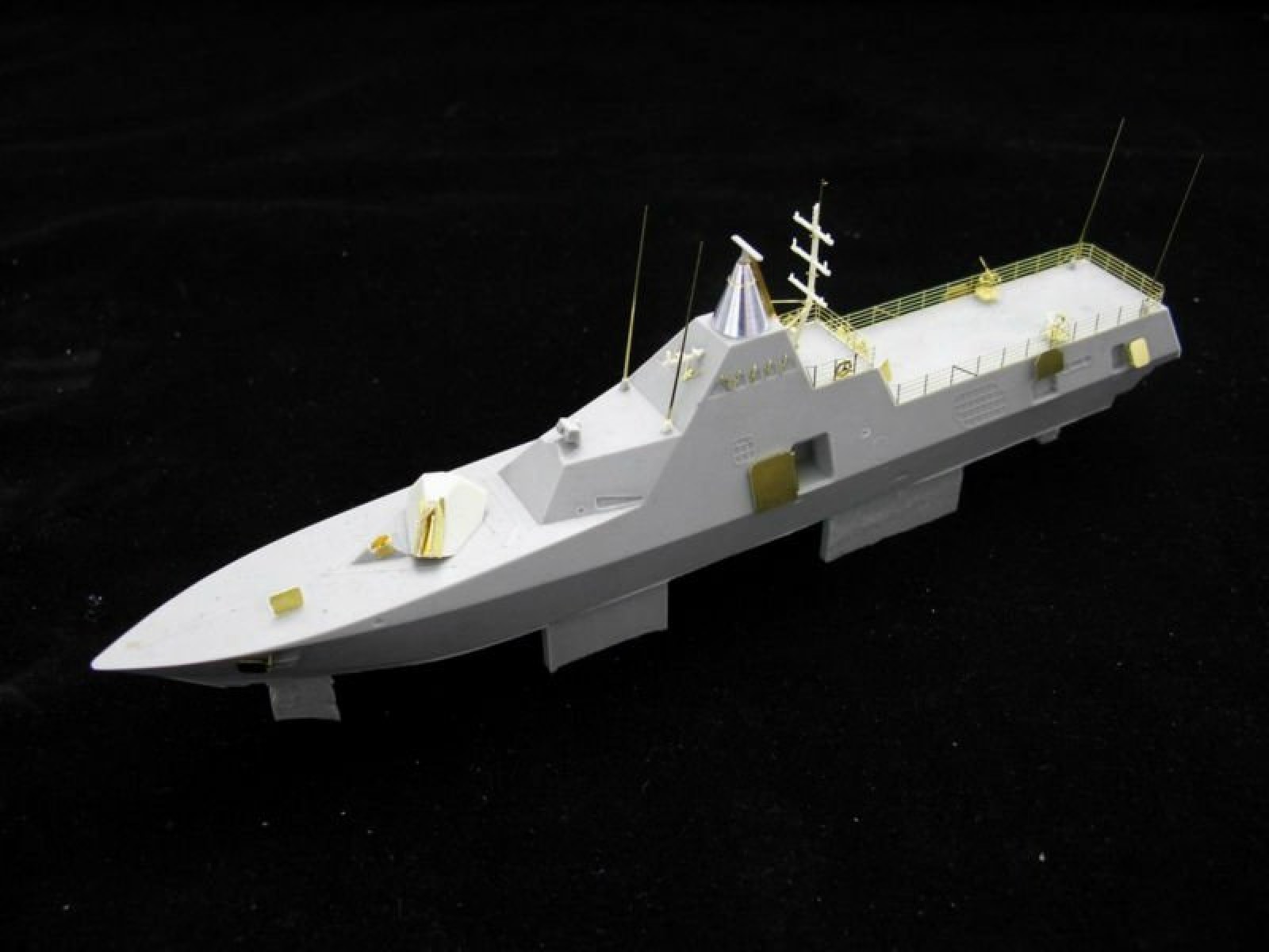Description: A model of a white military ship on a black surface with a black background and a yellow line on the front of the ship.
