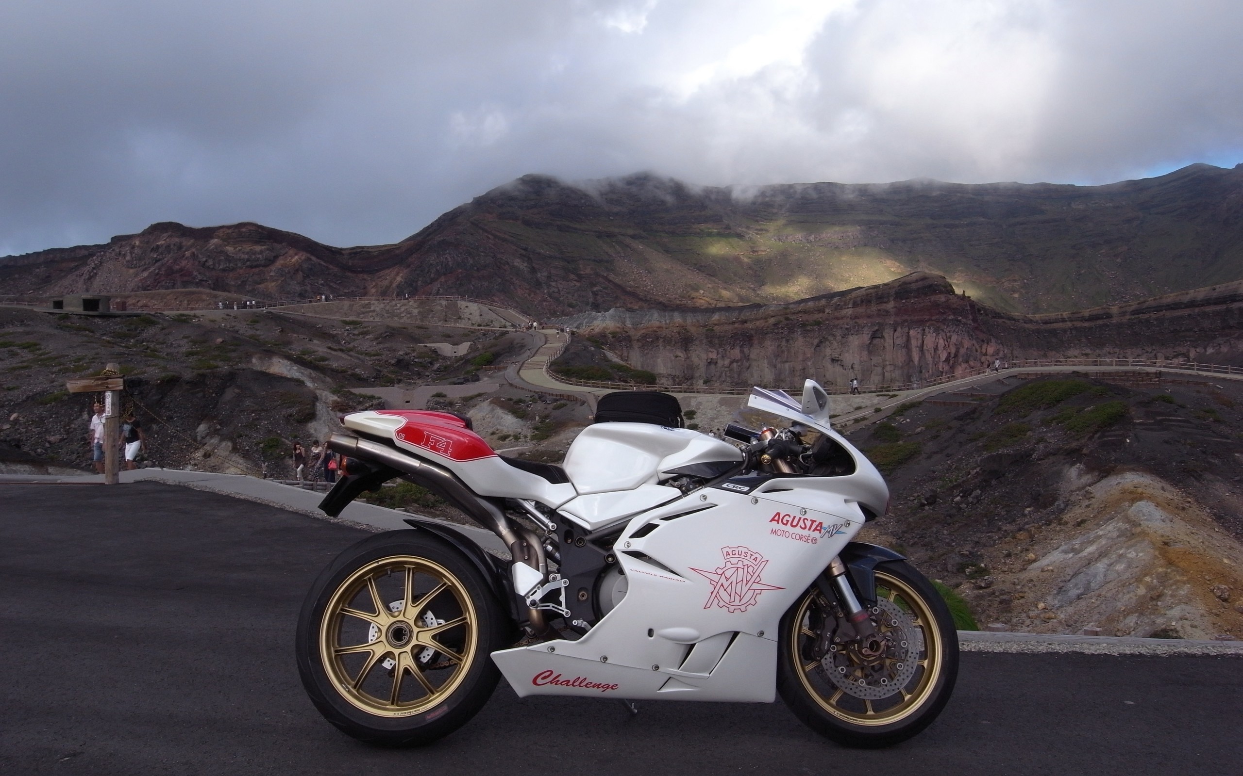 Description: A white motorcycle parked on the side of a road near a mountain range with a cloudy sky above it.